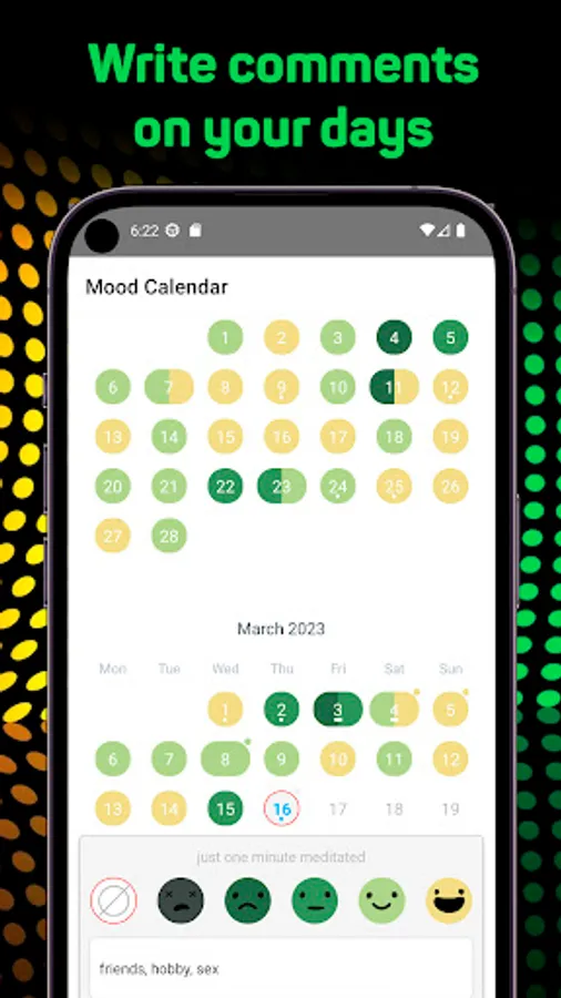 Be kind to your mind. «Day by day» helps to take a mindful approach to your mental health. Explore behavior patterns that may affect your mood by tracking them daily. Keep an eye on your moods and habits with an easy to use calendar. Build a stable meditation practice with the help of a simple timer and stats.