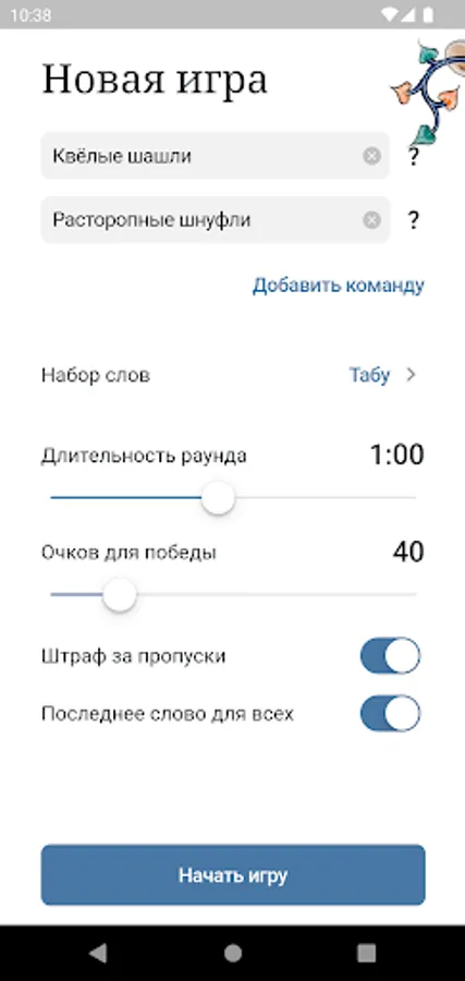 The goal of the game is to explain words to your team using synonyms, antonyms, descriptions, and other verbal clues. When explaining, you can not use parts of the word being solved, as well as single-root words. Only correctly guessed words count.