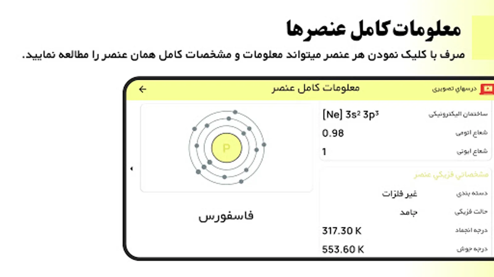 در جدول تناوبی افغان شما میتوانید معلومات ذیل را در باره یک عنصر بیابید: