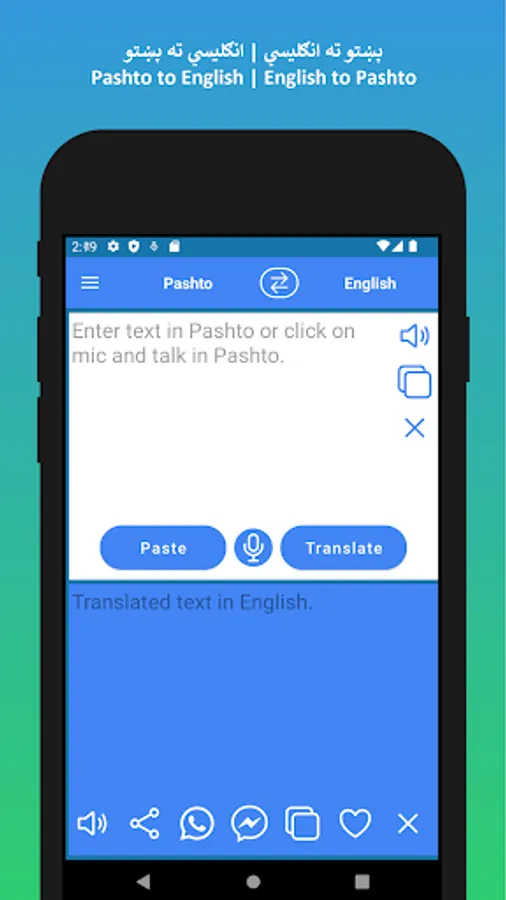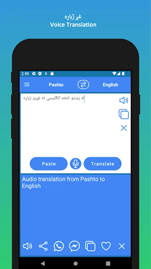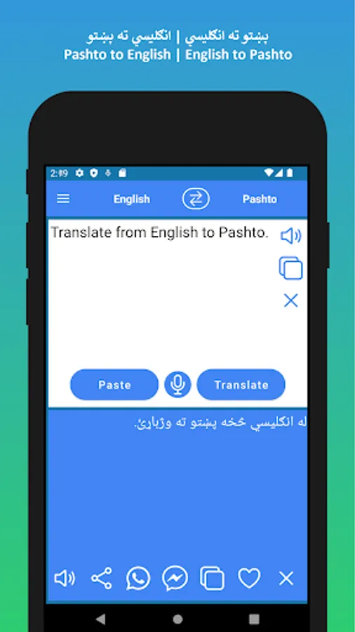 A) Click on 'Paste' button and our English to Pashto Translator app will translate the text.