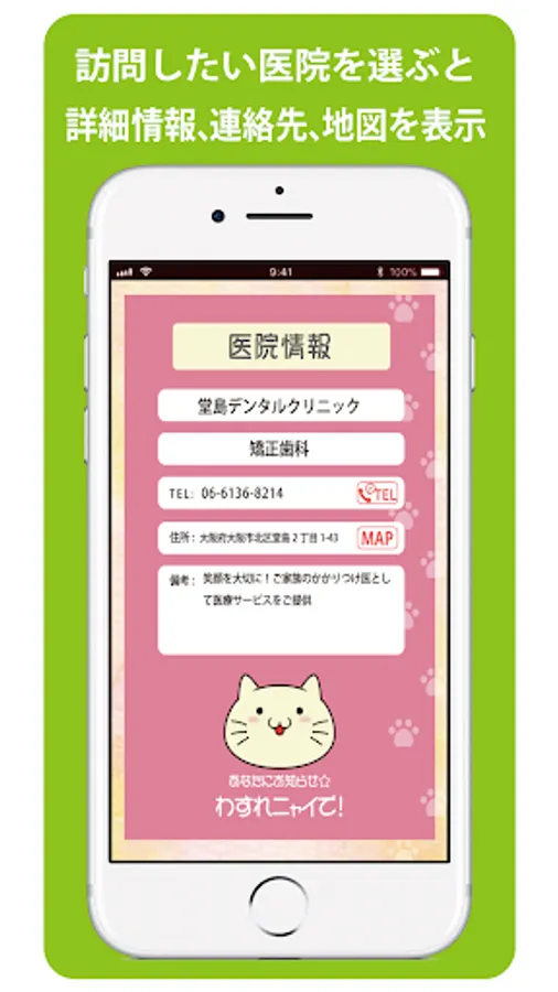 登録医院様の情報、アプリ画面から直接電話をかけられる機能。