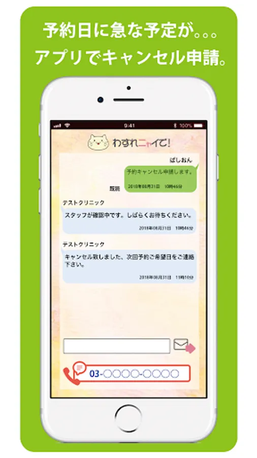 通知のお知らせを見て、万が一うっかり忘れてしまっていた場合、アプリ内コミュニケーション画面を使用して医院にキャンセル申請が可能です。