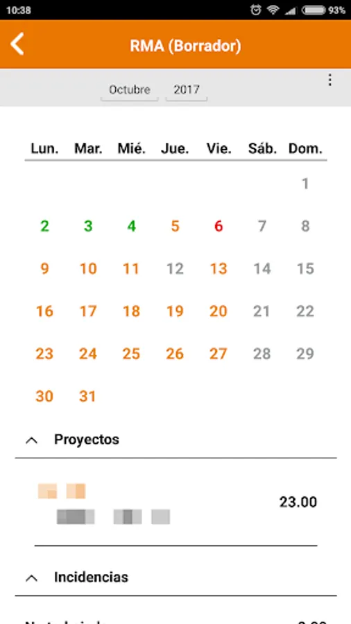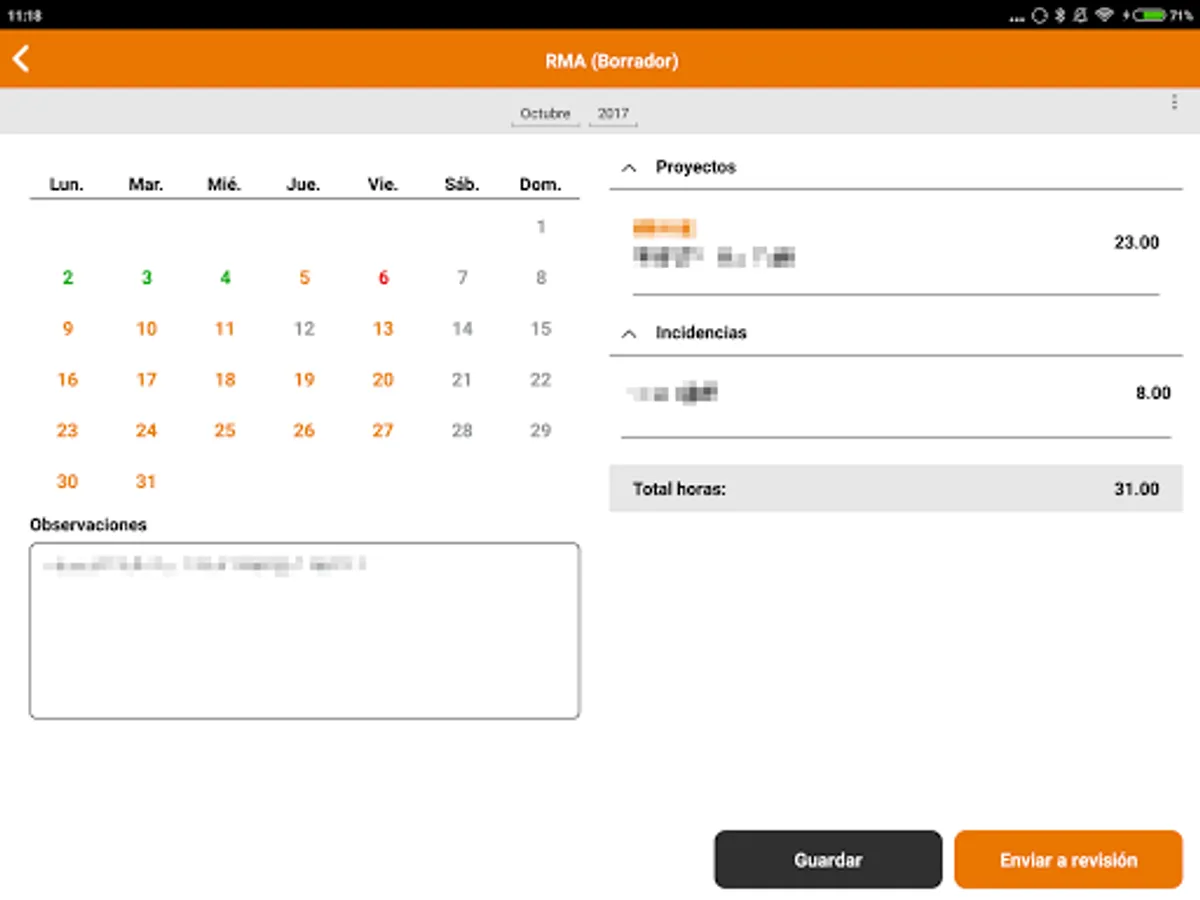 • Reporting hours. Enter the report workday hours assigned to each project and state official permits, vacation days and sick leave, with the option to perform bulk actions.