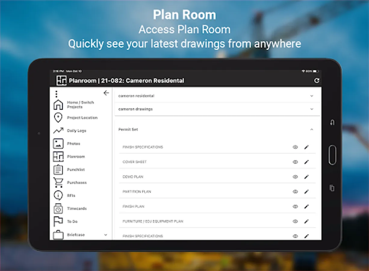 RedTeam Go's cloud-based construction management software on your Android phone and tablet helps you move seamlessly from the office to the field. With a mobile construction management solution, you are now clear to move about the job site and stay up to date with the latest project information, no matter where you are. Ideal for use during field walk-throughs and onsite operations. With just a few taps on your iPhone or iPad, drawings, daily logs, RFIs, time cards, punch lists, and all related project documents are easily accessible from one place.