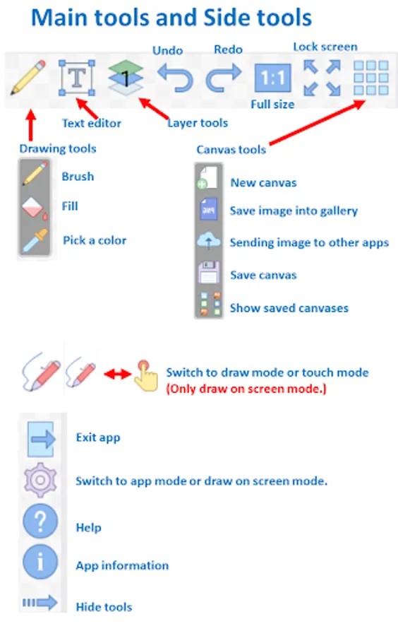 In the drawing mode you can draw on the screen, in touch mode you can operate the screen while displaying the image on the screen.