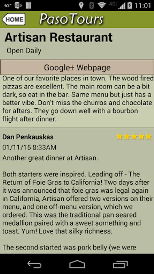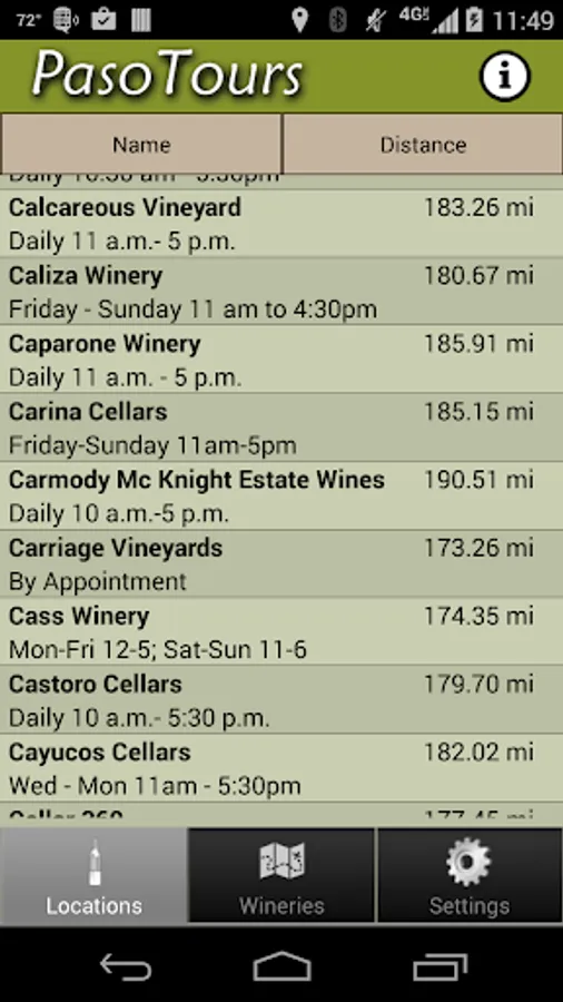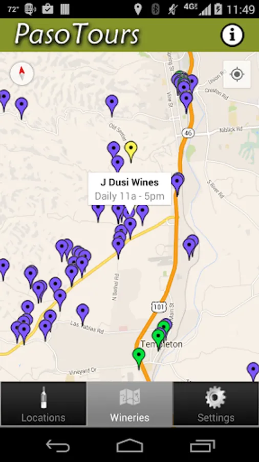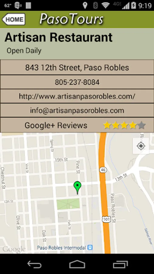 * Note: Since many of the back roads in Paso Robles are out of cell phone range, make sure and view the maps of the area in the Application while you are within coverage. That way the map will be in the memory cache while you are driving around. The application stores all the contact and address information locally but does rely on Google maps for map updating.