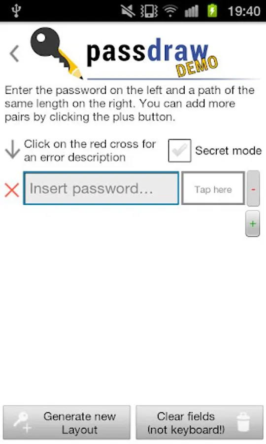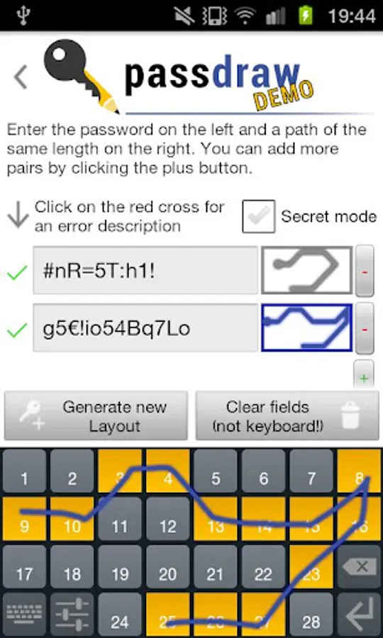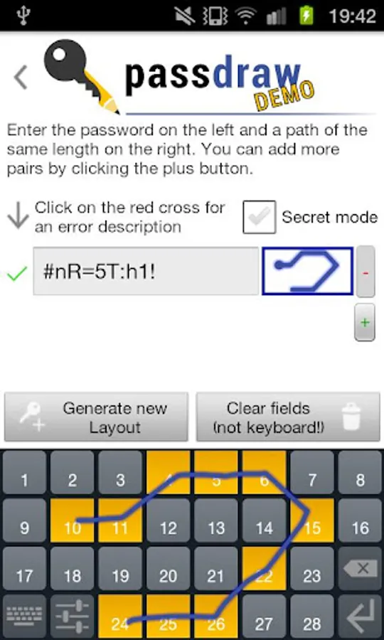 Additionally the layout is encrypted with the particular path - this means that if one only draws your path partially a completely different text is returned. So even if an attacker could read the keyboard layout he could not see your password. Passdraw too does not know which characters belong to your password and which not!