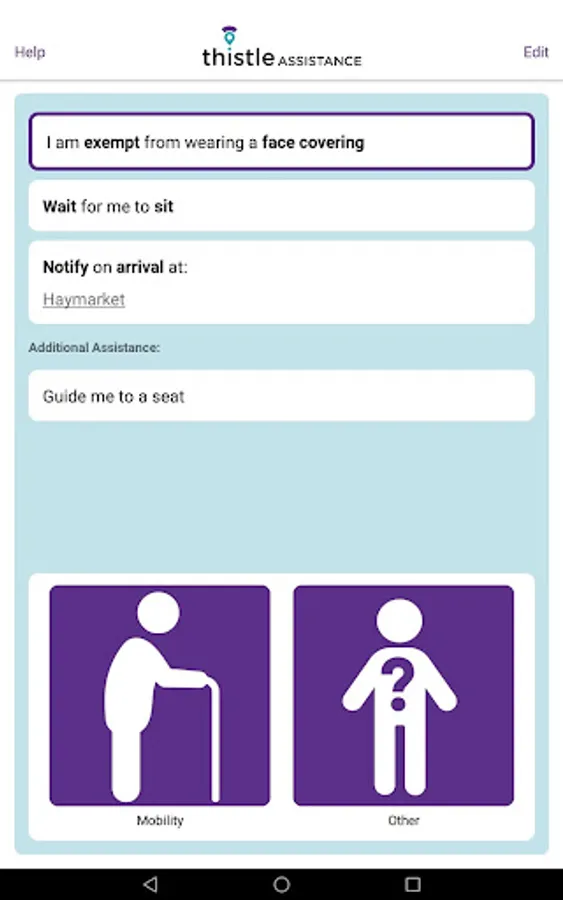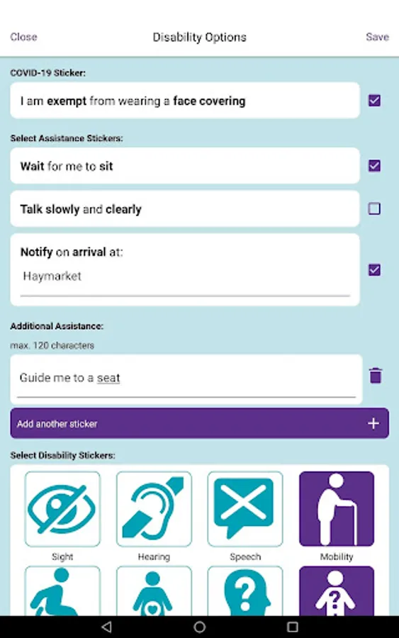 Before travelling, select the symbol which best reflects your disability or impairment and add a message to highlight the help you need to show to transport staff. It’s as simple as that. You can update or change the details you show at any time to reflect your personal circumstances.