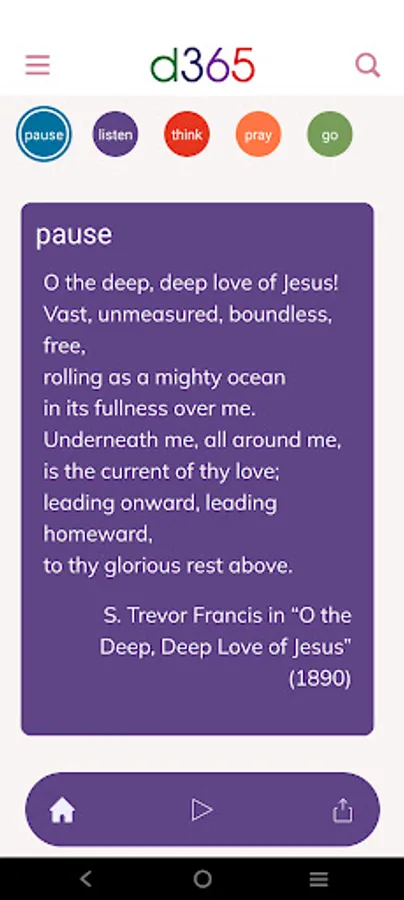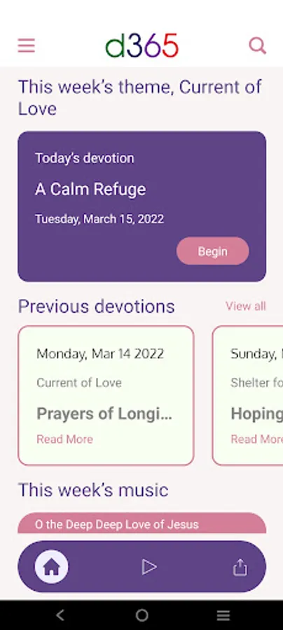d365 Daily Devotionals is the free mobile version of the online daily devotional experience read by millions of people. Since 2001, d365.org has provided relevant reflections for students on themes that impact their faith journey. With this app you can: Read daily devotionals, Listen to original d365 music, Set an alarm to remind you of your devotional each day, and Read past devotionals in the archive. The d365 daily devotional site is produced by Passport, Inc. d365 is made possible through individual gifts and the support of three denominational sponsors: Cooperative Baptist Fellowship, Presbyterian Church (USA), and the Episcopal Church. If you have found this app useful in your spiritual walk, please consider a gift so that this ministry may continue growing to reach others in the name of Jesus.