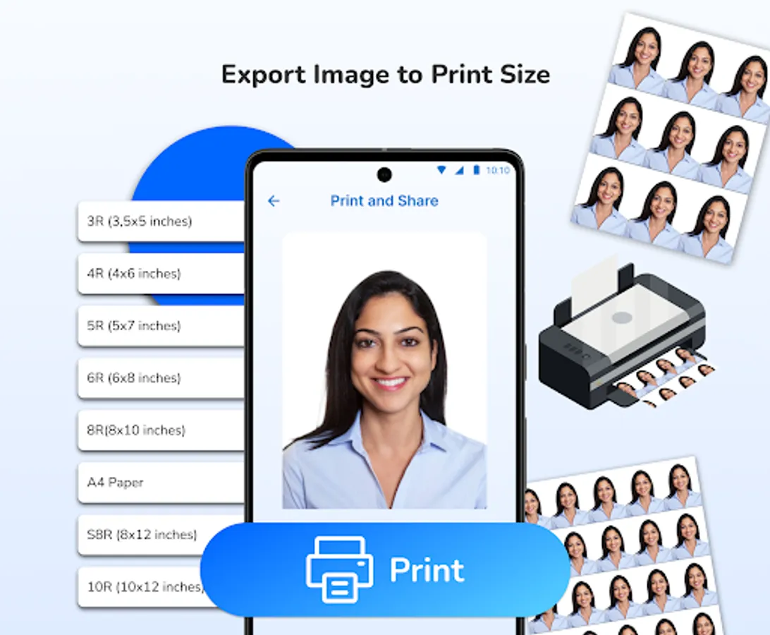 By combining ordinary passport, ID, or VISA images onto a single sheet of 3x4, 4x4, 4x6, 5x7, or A4 paper, you can save money. Then you can go to a print shop and order prints. Alternatively, you can have your phone printed at a local photo print shop.