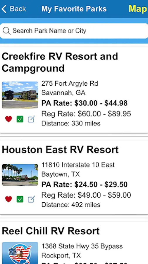 - Mark your Favorite or Visited Campgrounds, and see those on a map as color-coded pins.