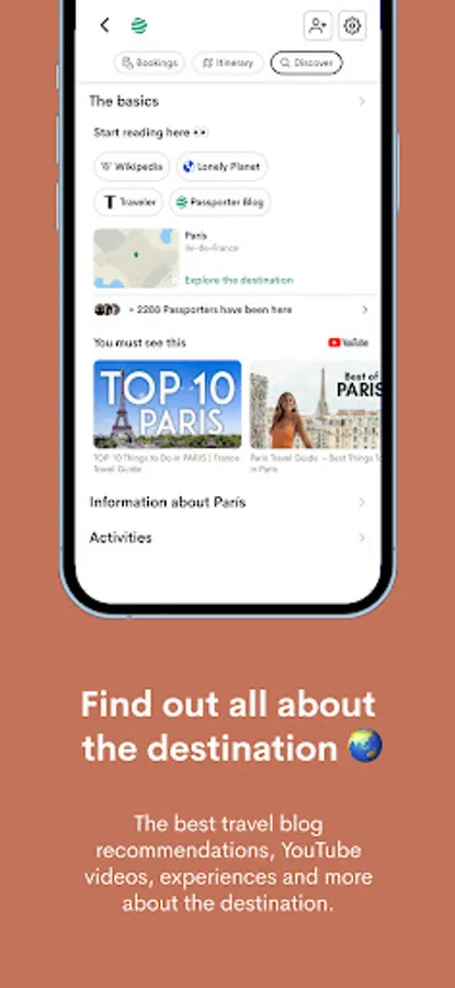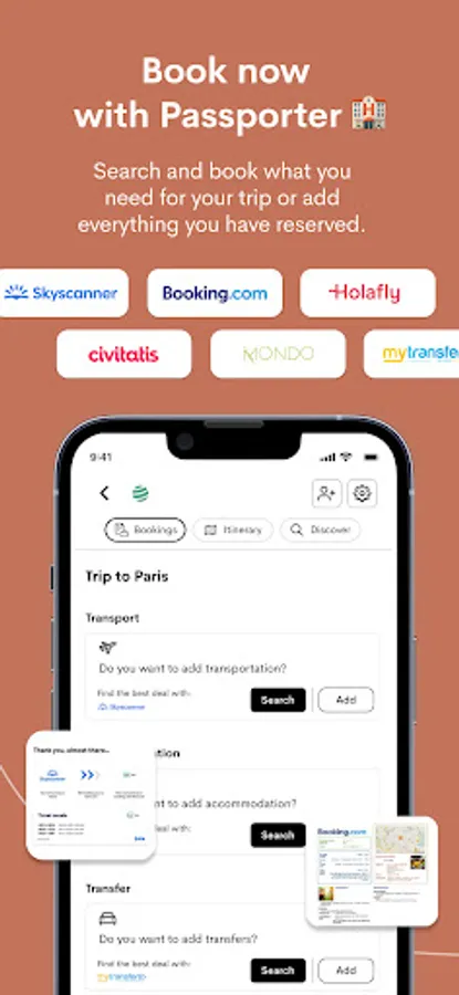 Our goal is to become your personal travel guide, a planner that will accompany you in all phases of your adventure. The Passporter app has been designed to inspire you with travel inspiration and recommendations from travelers like you. To organize your trip either alone or with your group of friends by inviting them to edit your itinerary. Book your flights, accommodations or activities directly from the app or upload them in PDF format. Highlight points of interest on the map of your route and organize it by days, stages or types of travel. And most importantly, you will be able to share all your travel recommendations with your friends and family :) We travel with you wherever you go. 🌍