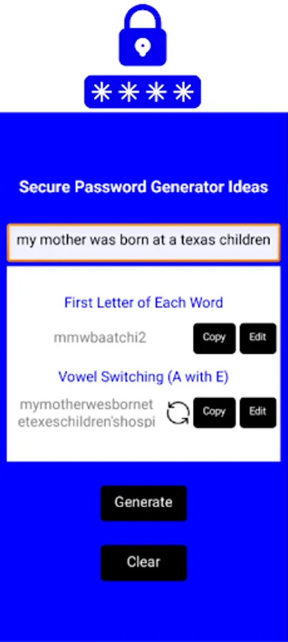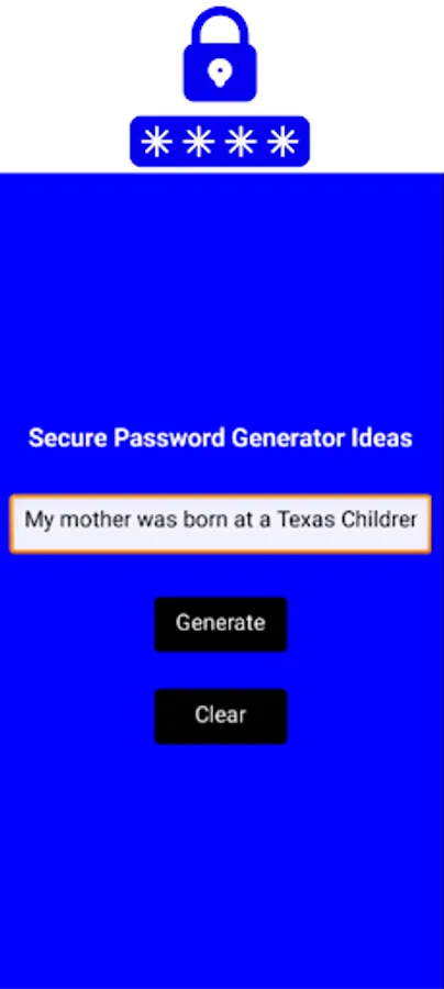 "My mother was born at a Texas Children's Hospital in 2000" the app will take the first letter of each word "mmwbaatchi2" so you can customize it