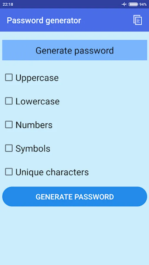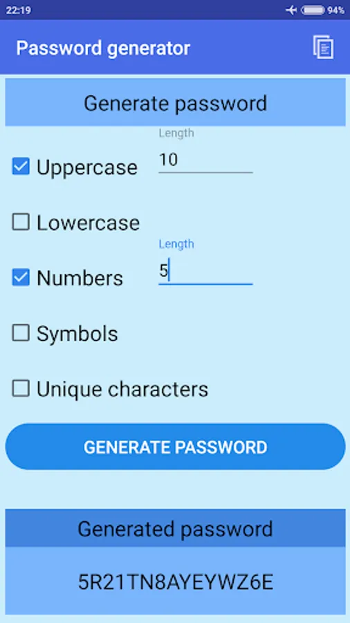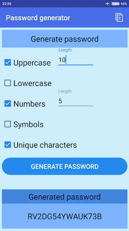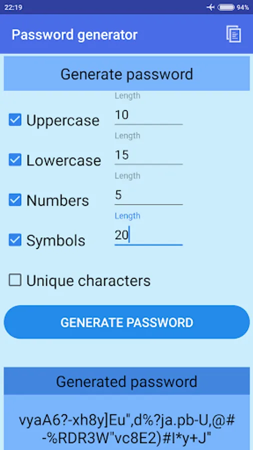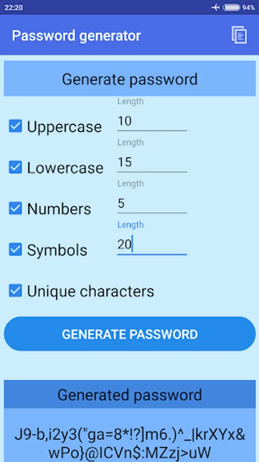 With this free app you can generate strong passwords.You can select if you want uppercase, lowercase, numbers, symbols, the length of each of them and if you want the password contains unique characters or not.