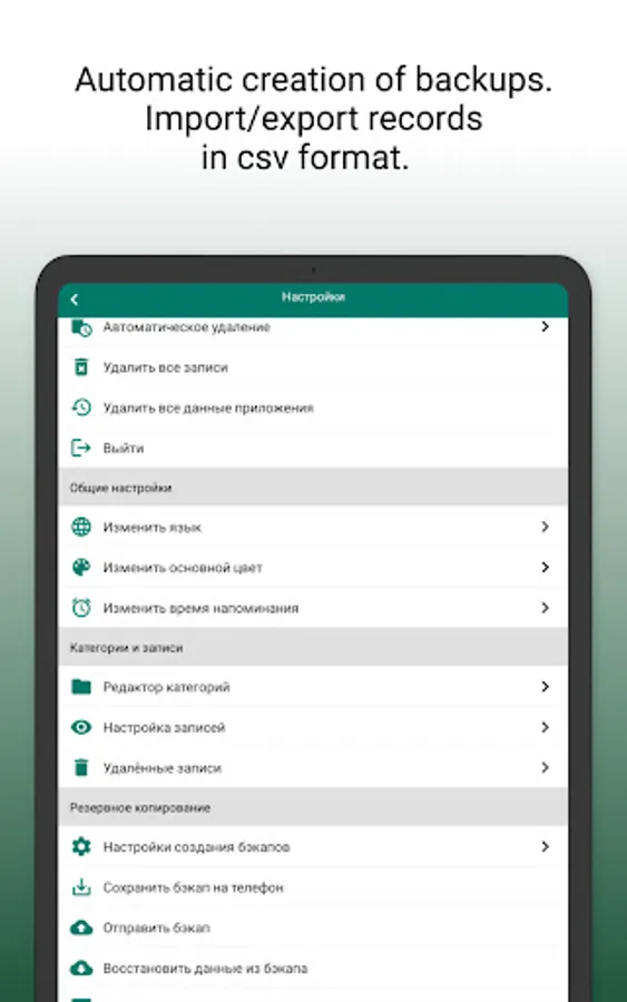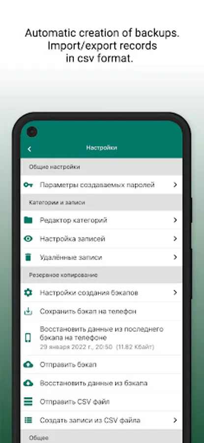For additional security of your data, the function of automatic blocking of the application is implemented, as well as the function of automatic deletion of entries in case of loss or theft of a mobile device.