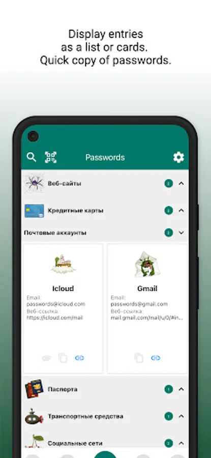 For a quick search, you can group and filter your entries into categories, such as "Bank cards", "Accounts", "Mail accounts", and mark any entry as "Favorites".