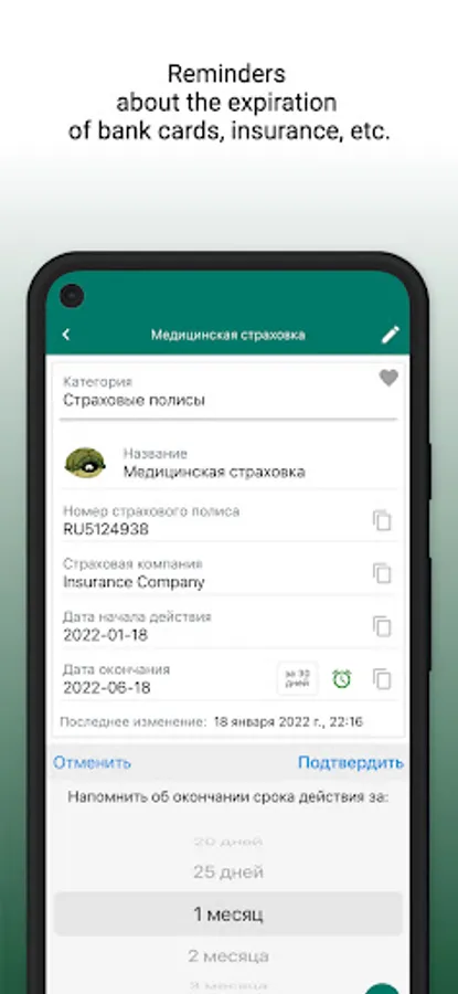 Certain categories support the function of setting a reminder about the expiration date of your bank card, passport, etc. You just need to activate this function for the created entry and choose for what period before the end you would like to receive a reminder.