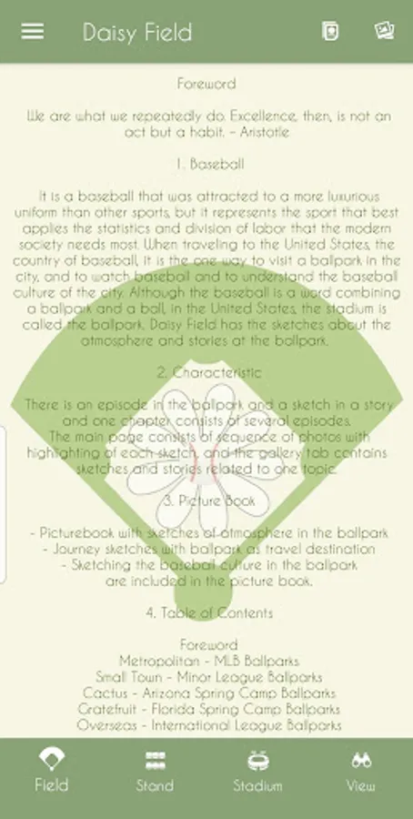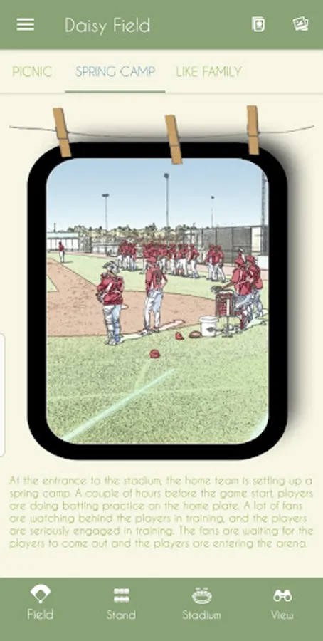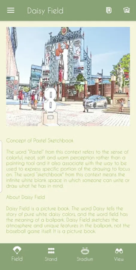 Daisy Field is a picture book. The word "Daisy" tells the story of pure white daisy colors, and the word "field" has the meaning of a ballpark. Daisy Field is a picture book that sketches the atmosphere and unique features in the ballpark, not the baseball game itself.
