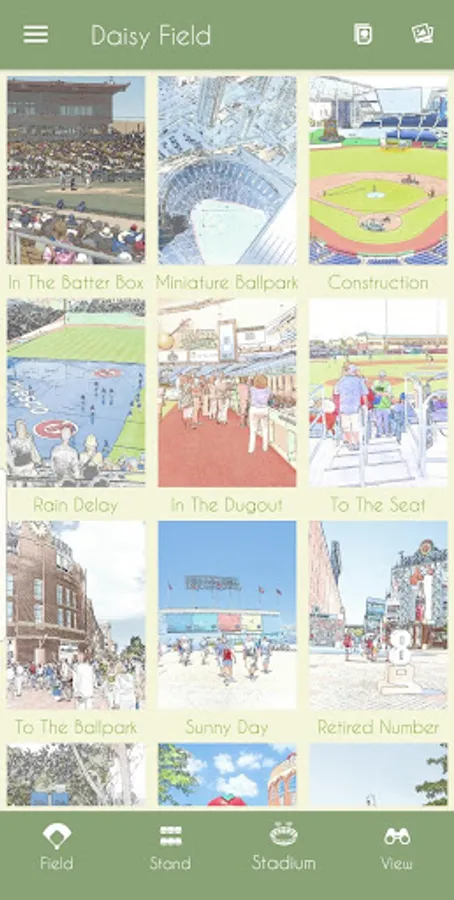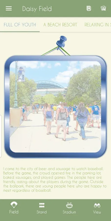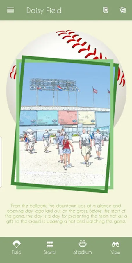 Although the baseball is a word combining a ballpark and a ball, in the United States, the stadium is called the ballpark. Daisy Field has the sketches about the atmosphere and stories at the ballpark.