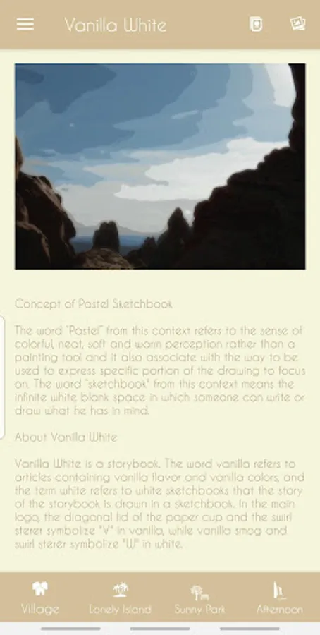 White is a storybook. The word "vanilla" refers to articles containing vanilla flavor and vanilla colors, and the term "white" refers to white sketchbooks that the story of the storybook is drawn in a sketchbook. In the main logo, the diagonal lid of the paper cup and the swirl sterer symbolize "V" in vanilla, while vanilla smog and swirl sterer symbolize "W" in white."