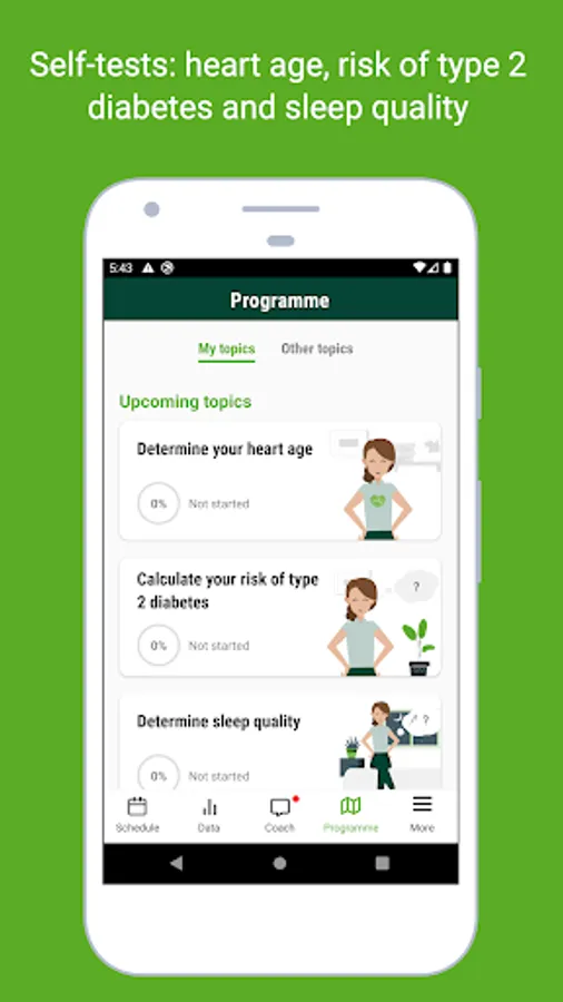 - Self-tests: heart age, risk of type 2 diabetes and sleep quality