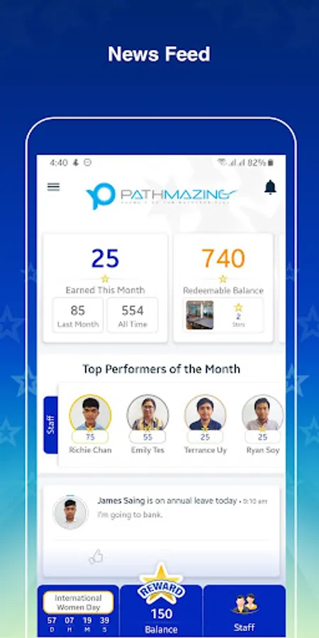 STARS by Pathmazing is an HR tool that increases the engagement level of employees through timely recognition by giving out rewards. This reward program is intended to recognize and motivate staff by awarding "Stars" similar to any loyalty program. These "Stars" are typically awarded by managers, however, given its flexibility, other staff members may award “Stars” as well -- designed to mimic a 360-degree feedback mechanism. Staff members may use their earned or rewarded "Stars" to bid in an auction or redeem rewards via an integrated catalog of prizes.