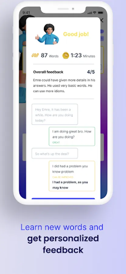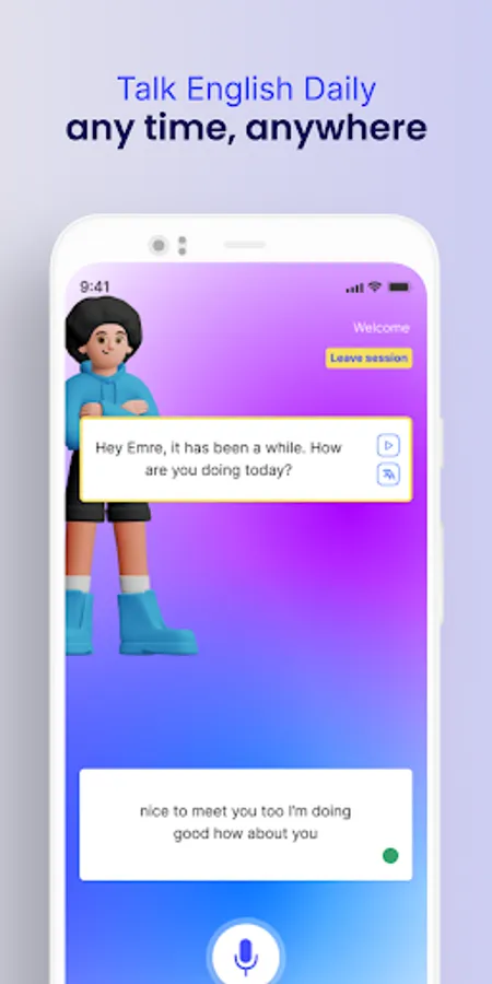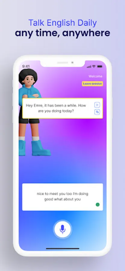 Yapay zeka ile size özel bir İngilizce öğretmeni edinin, sınırsız İngilizce konuşma pratiği yapın. İstediğiniz zaman İngilizce konuşurken, bir yandan da dinleme ve kelime bilginizi artırın. Konuşmalarınıza dair anında geri bildirim alarak canlı bir öğretmenin sağlayamayacağı zenginlikte bir konuşma deneyimi yaşayın, çok daha hızlı gelişin.