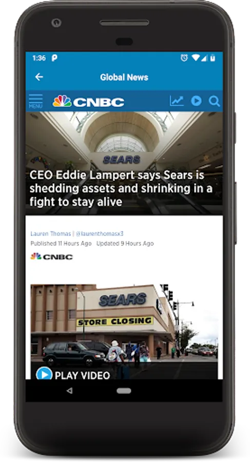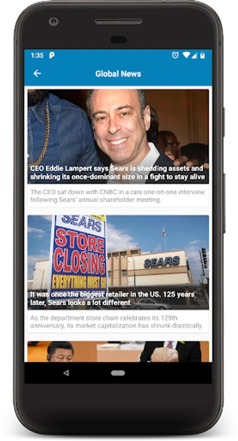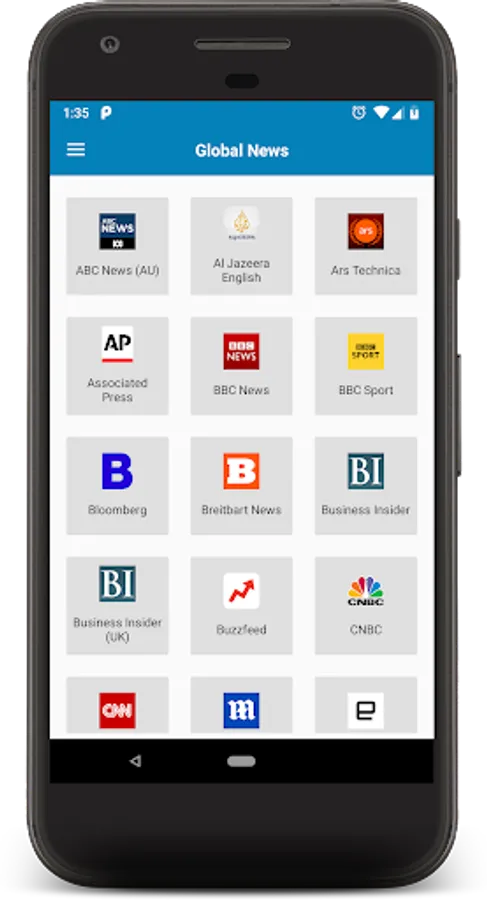 Global news can provide headlines from 70 worldwide reliable sources, including: ABC News (AU), Associated Press, BBC News, BBC Sport, Bild, Bloomberg, Business Insider, Business Insider (UK), Buzzfeed, CNBC, CNN, Daily Mail, Engadget, Entertainment Weekly, ESPN, SPN Cric Info, Financial Times, Focus, Football Italia, Fortune, FourFourTwo, Fox Sports, Google News,Gruenderszene, Hacker News, Handelsblatt, IGN, Independent, Mirror, MTV News, National Geographic, New York Magazine, Recode, Reddit, Reuters, TechCrunch, The Guardian, The New York Times, The Times of India etc