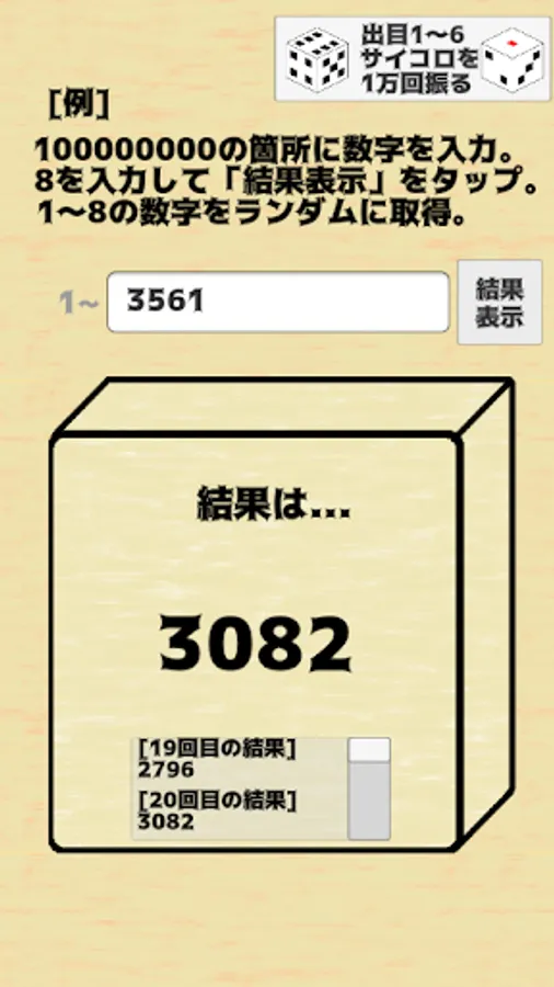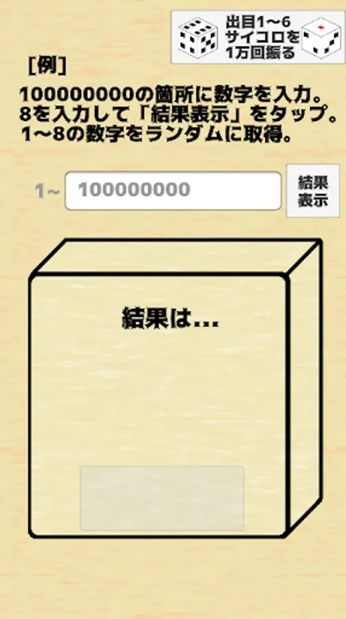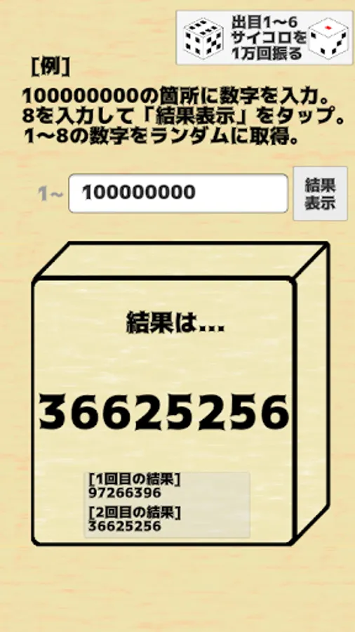 -Easy to use, a simple structure where you can enter a number in the place of 100000000 and tap "Result display" to get a random value.