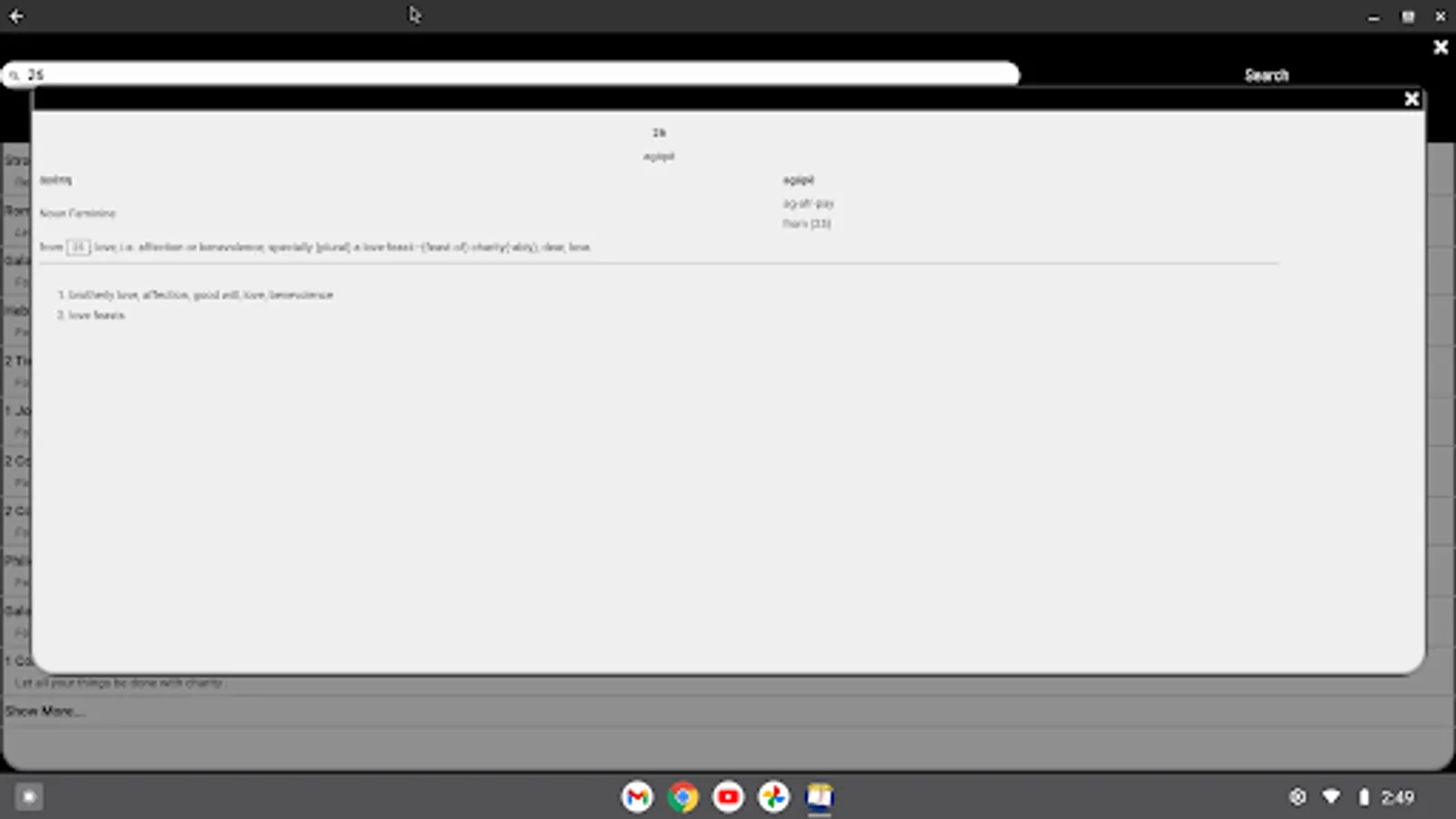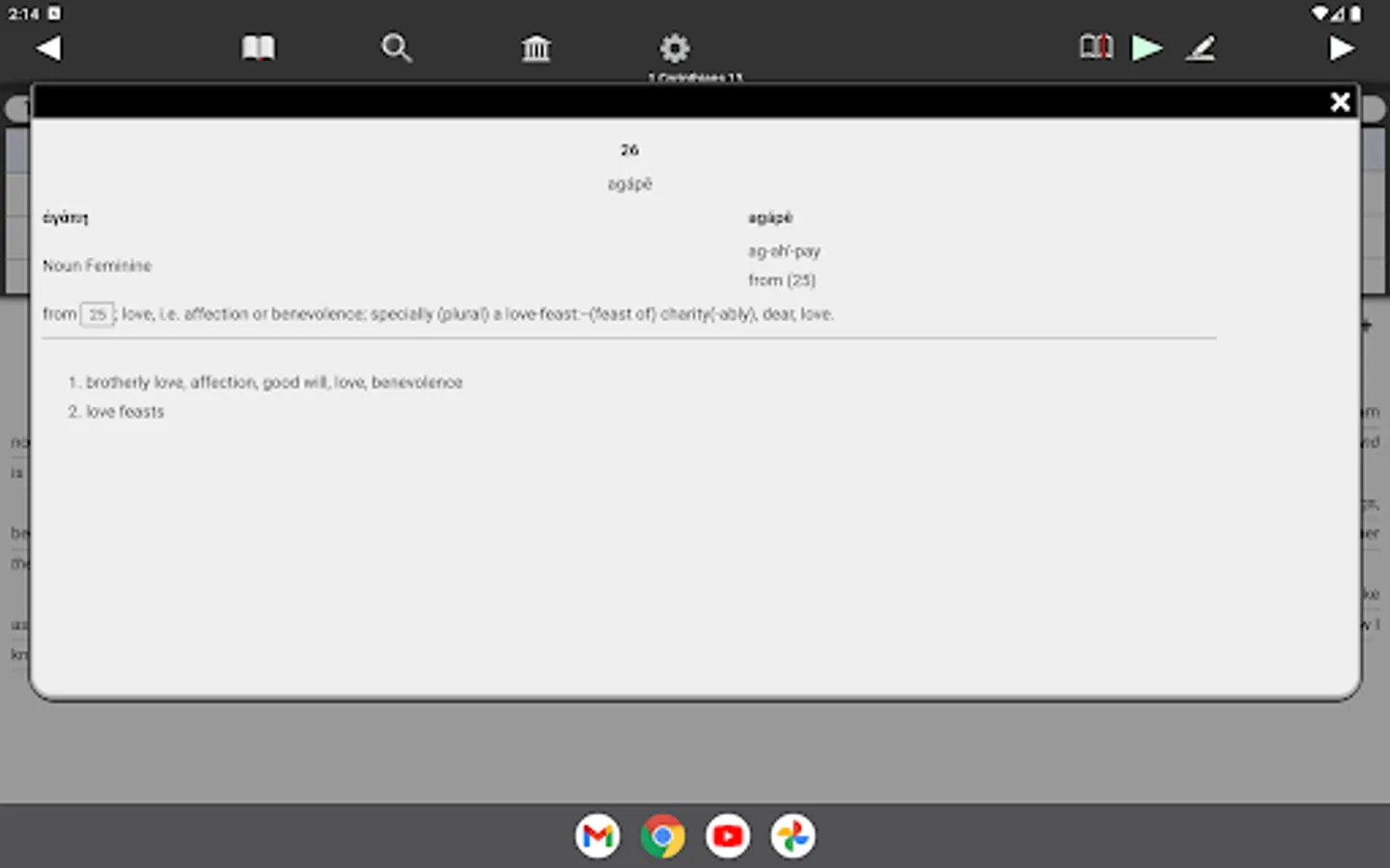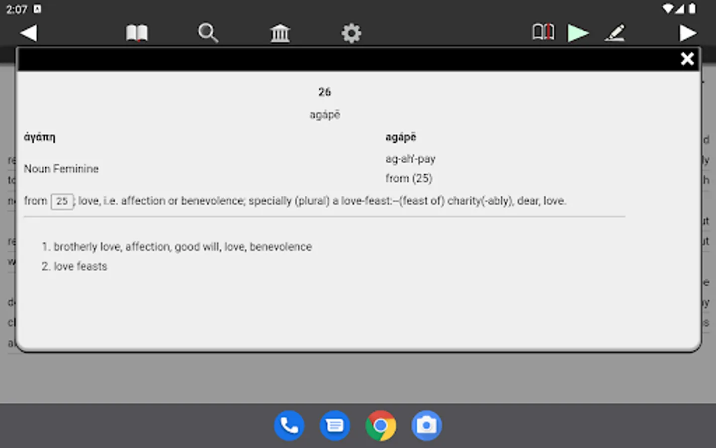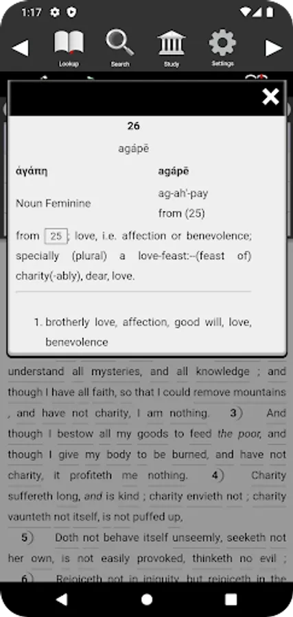 Touch Bible makes looking up words easy. While you read the bible you'll see that most words are links. Click on a linked word and you'll get so much information about the word.