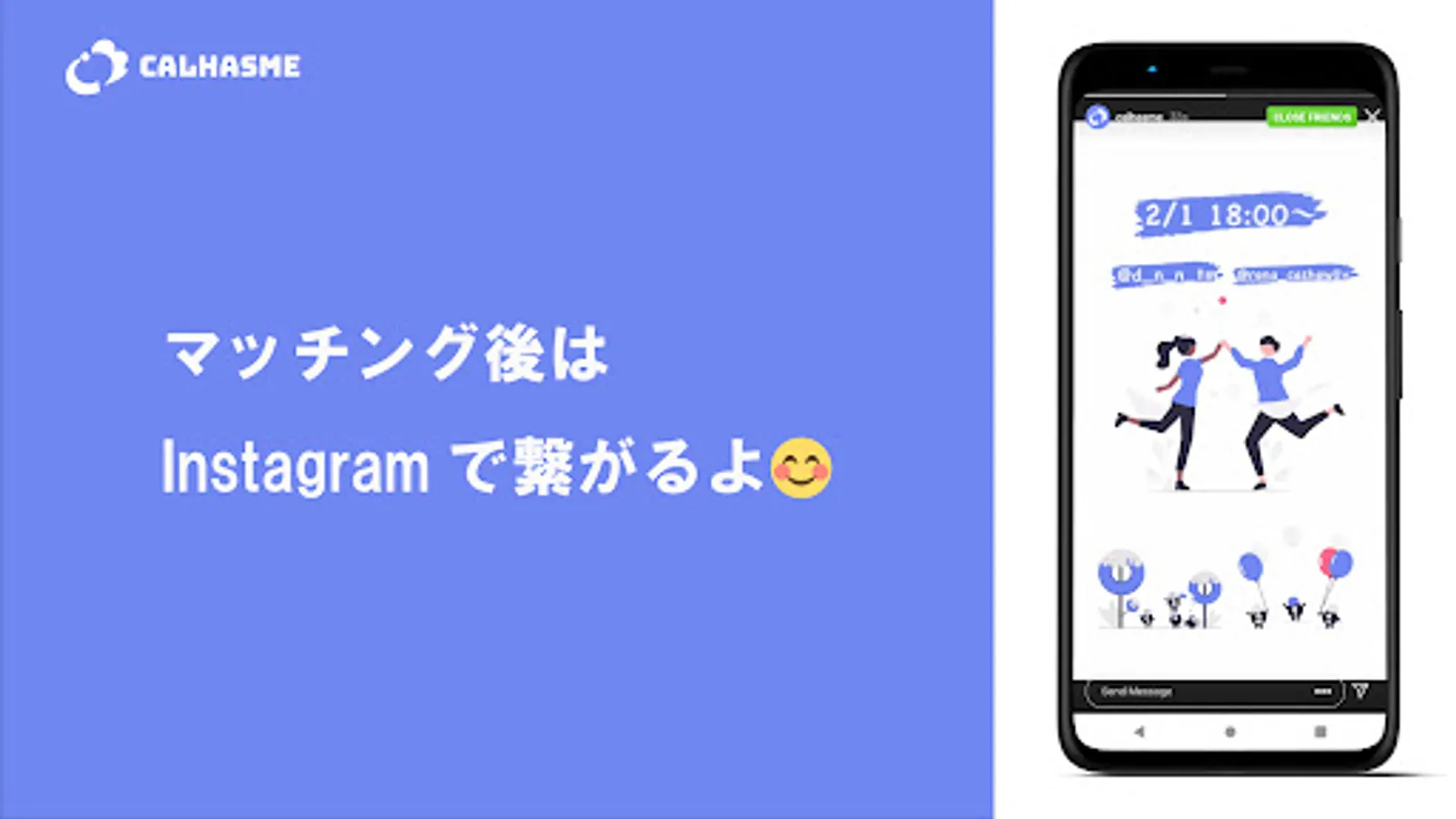 Also, in your Instagram account run by CalHasMe, you and your partner will be added to your "close friends" list and they will be mentioned in the "close friends" story. (* Mentions in the story are manually managed and may be delayed. If the mentions are late, please refer to CalHasMe's matching notification and send a message to the other party.)