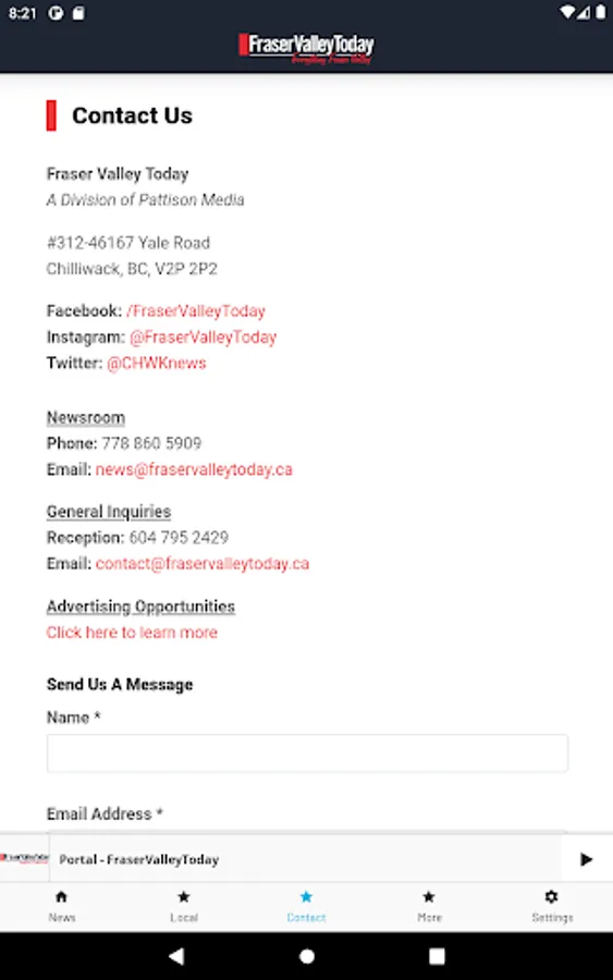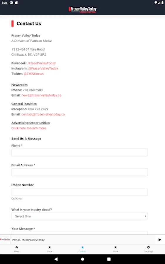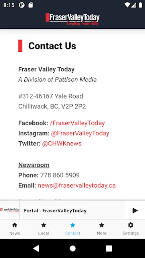 Fraser Valley Today is the go-to online newspaper for news and community information in The Fraser Valley. The Fraser Valley Today newsroom focuses on the news and information that matters. Staffed with the community's most experienced and well-respected reporters, the Fraser Valley Today newsroom operates 7 days a week to provide readers with up-to-date news, weather, and sports coverage.