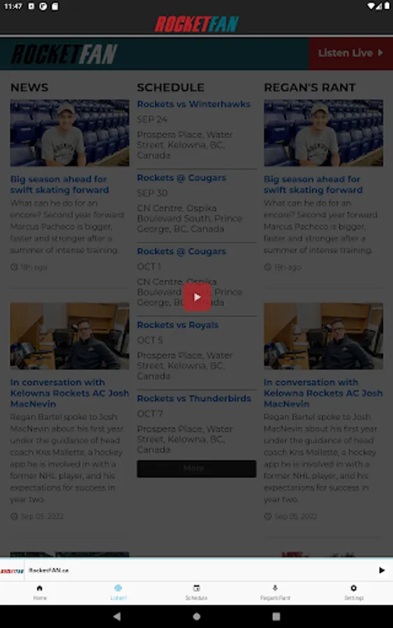 The RocketFAN app delivers everything a fan would want all in one app! Catch every Kelowna Rockets home and road game all season