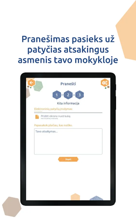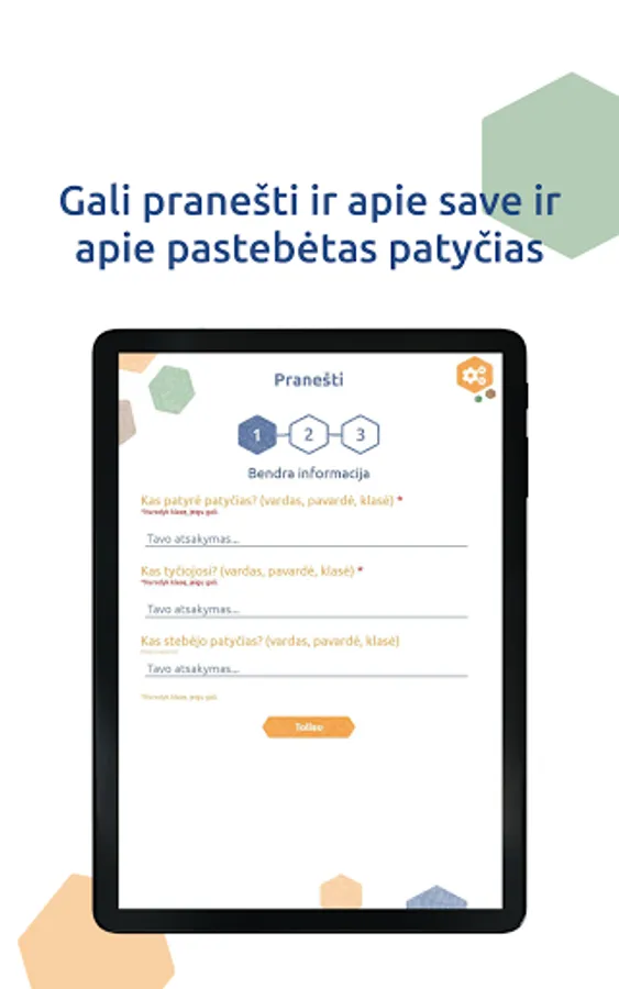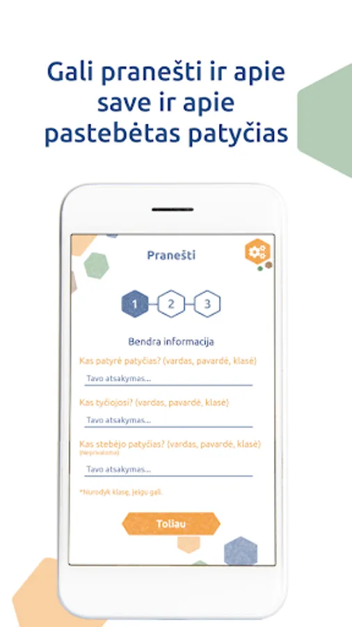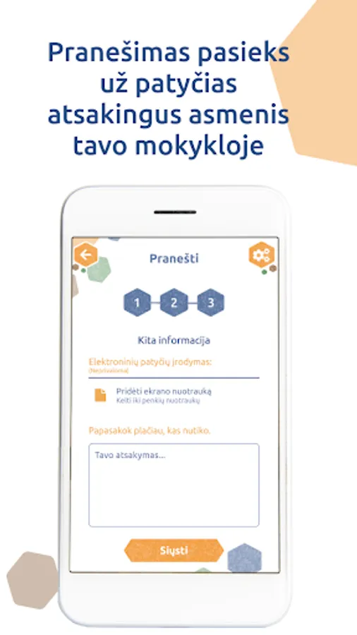"Patyčių dėžutė" is a mobile application designed to allow students at participating schools to safely and anonymously report acts of bullying. Once the student makes report of bullying, it is automatically sent to the designated school member. It‘s also 100% anonymous!