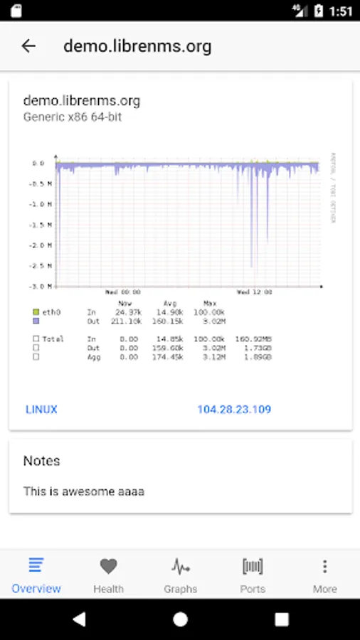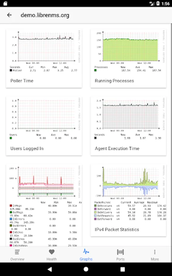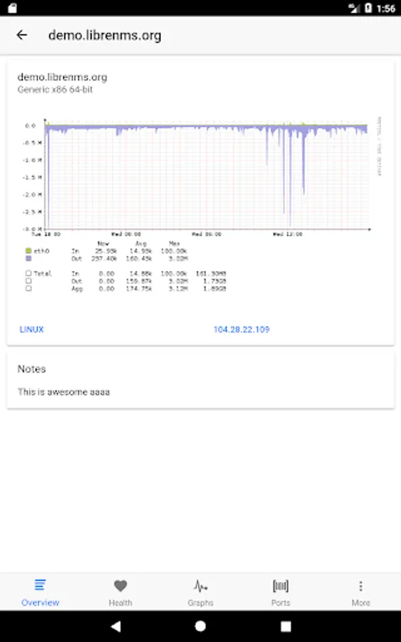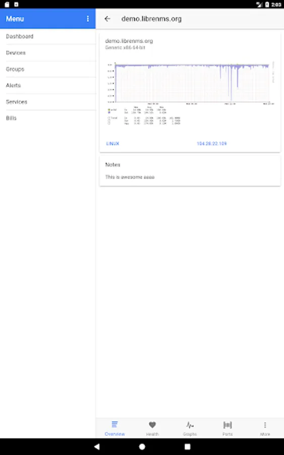 myLibreNMS helps you monitor your servers and networking devices and includes support for many devices including Cisco, Linux, FreeBSD, Juniper, Brocade, Foundry, HP and many more. This application accesses your LibreNMS instance and displays it on your mobile device.