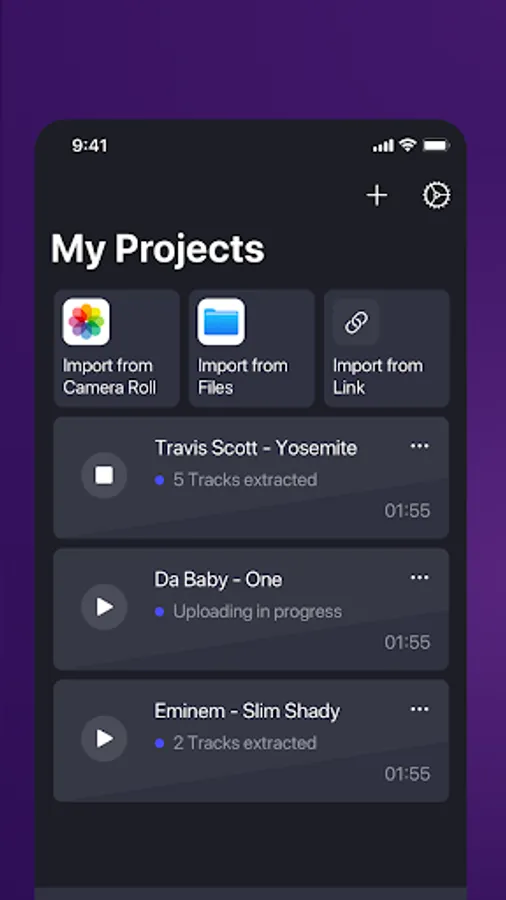 All your processed songs are available on the projects page. Once processed all separated music instruments and vocal tracks will be available for sharing or audio editing.
