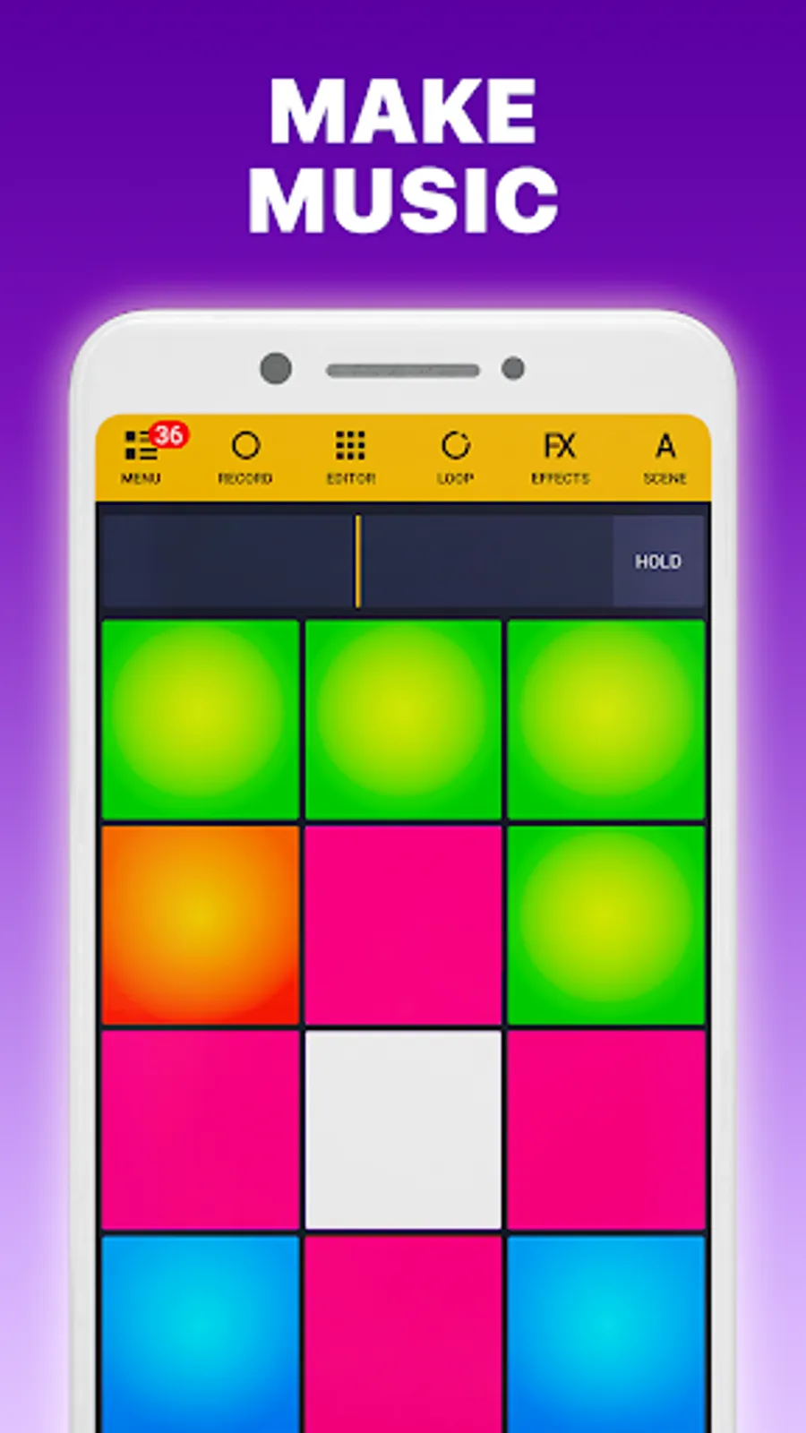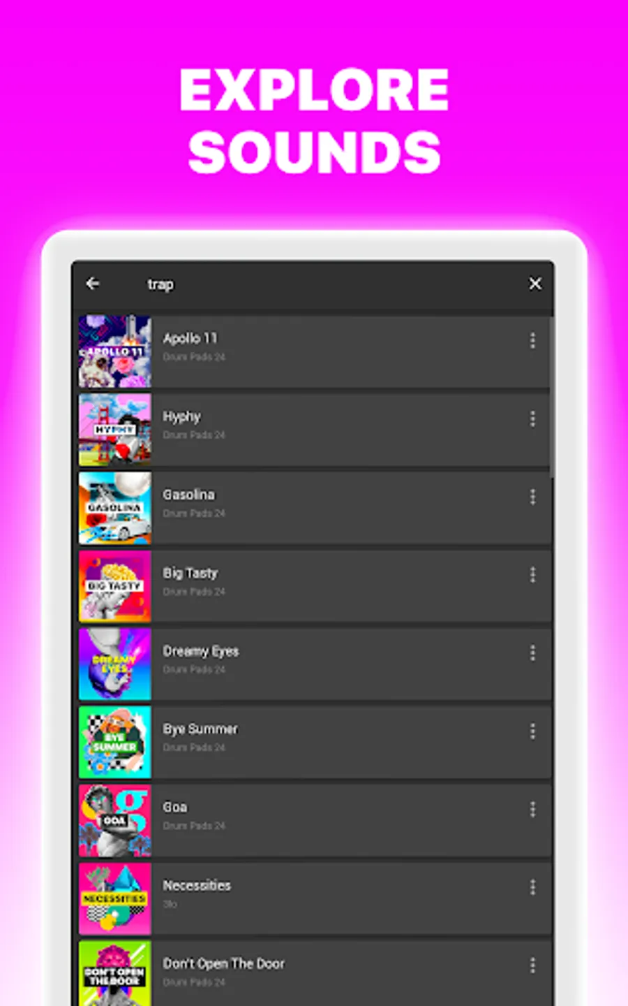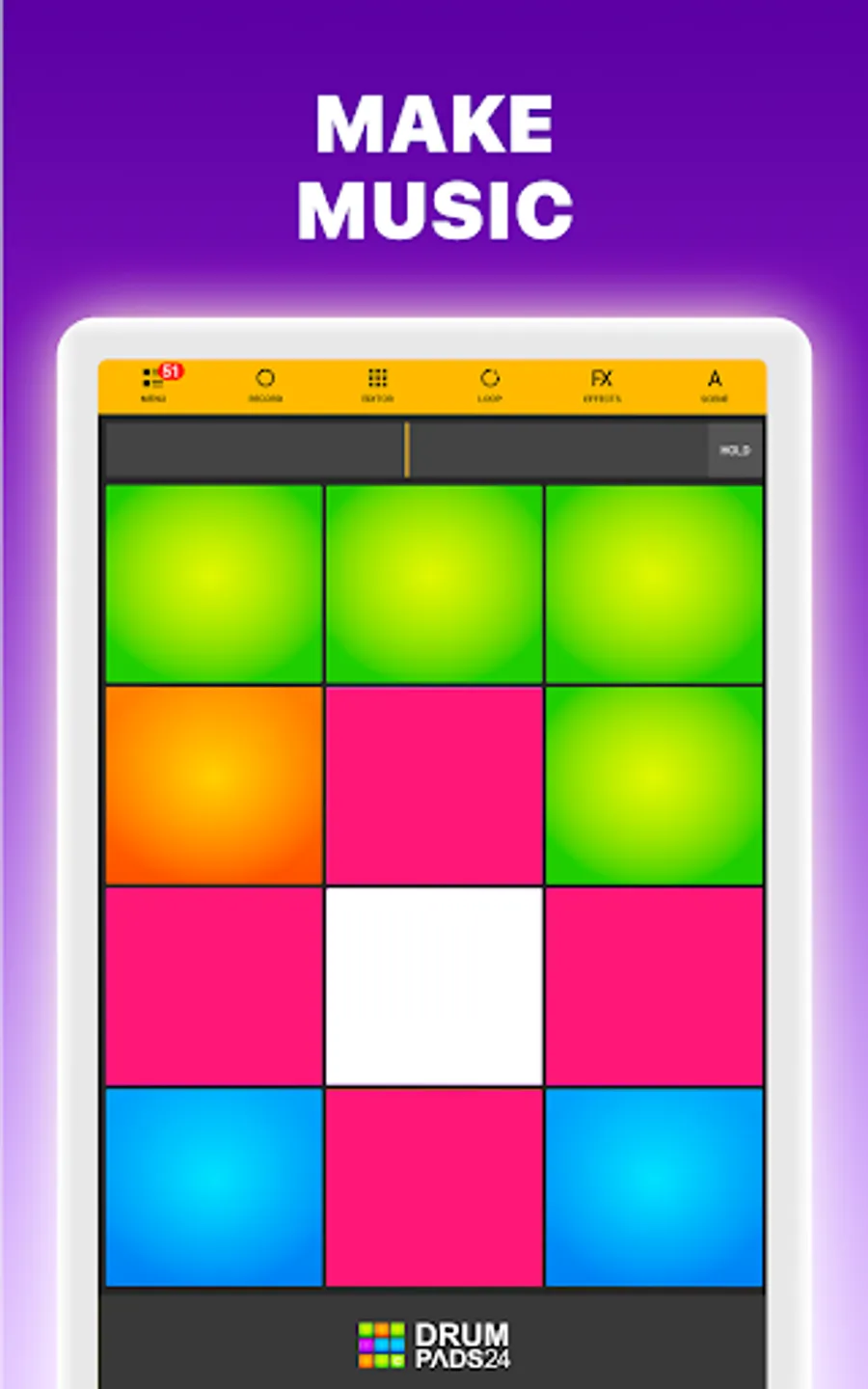 There are 2800+ high-quality sounds in our library of music create app. New sound packs are released every week. Use Drum Pads 24 to create your own music or mixtapes.