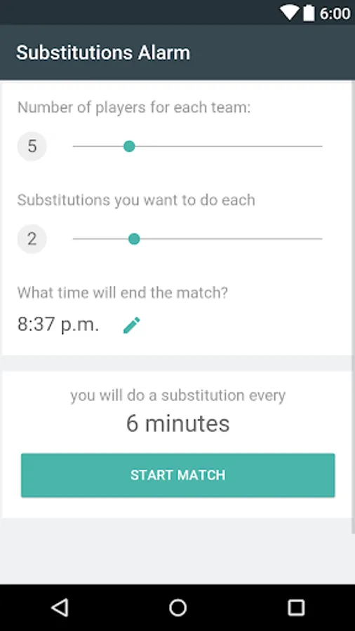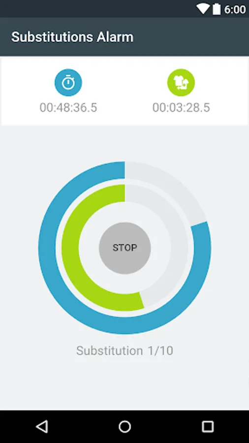 With an easy to use interface you can set match time end, how many players in your team and how many substitutions you want to do each. Players game time is automatically calculated and, at the expiration of each interval, you will be alerted by a loud alarm!
