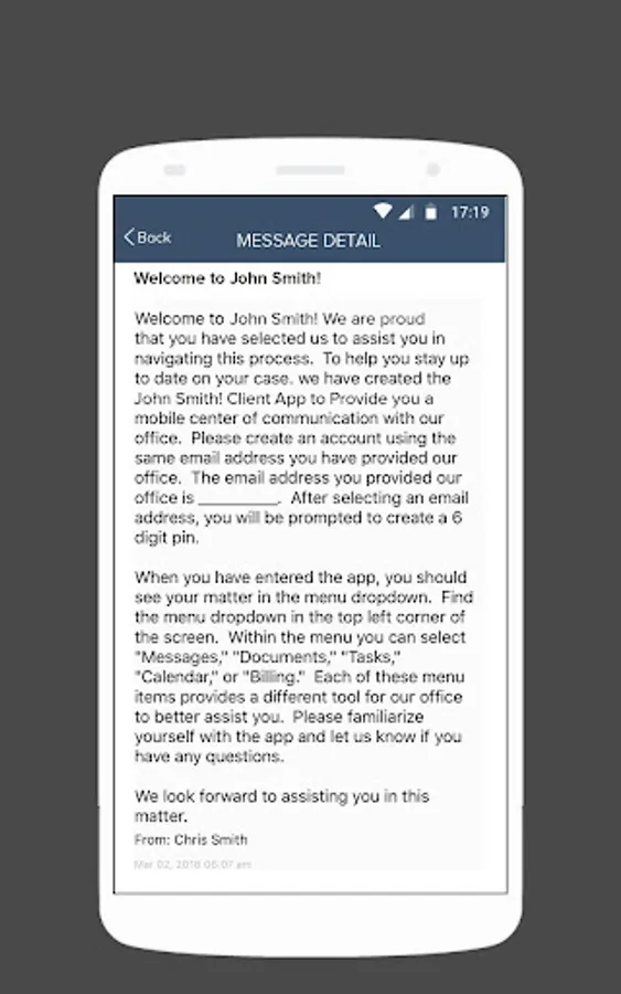 The MP Wright Law Group Law is for clients of the law firm MP Wright Law Group. The App is intended to assist clients in communicating with their attorney and staying informed regarding their case. Clients may utilize a message feature to send and receive messages with their attorney, as well as upload and view documents, receive assigned tasks from their attorney, view their case calendar, and stay up to date on their bill. The MP Wright Law Group is intended to supplement traditional means of communication and insure the clients of MP Wright Law Group are thoroughly informed.