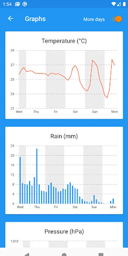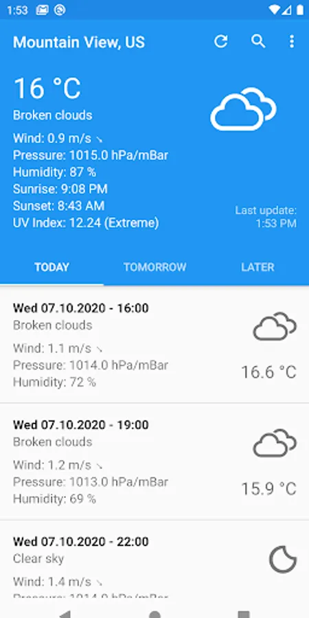 ● Extra useful information: real temperature, humidity, rain chance, air pressure, wind speed, uv index