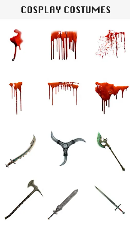 - Bloody stickers for super cool cosplay photo! Add bloody wounds, bruising, blood sprays and blood on cosplay photo.