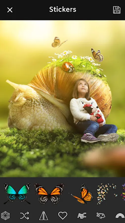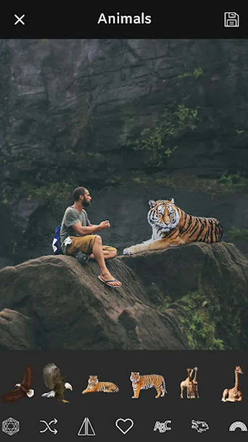 Nature Frames Photo Editor has 100+ stickers. Add wild animal stickers like lion, tiger, zebra, bear, elephant, horse etc. Select any sticker drag it to right position, zoom in or zoom out, rotate it, flip it and set it at the suitable position on the photo.