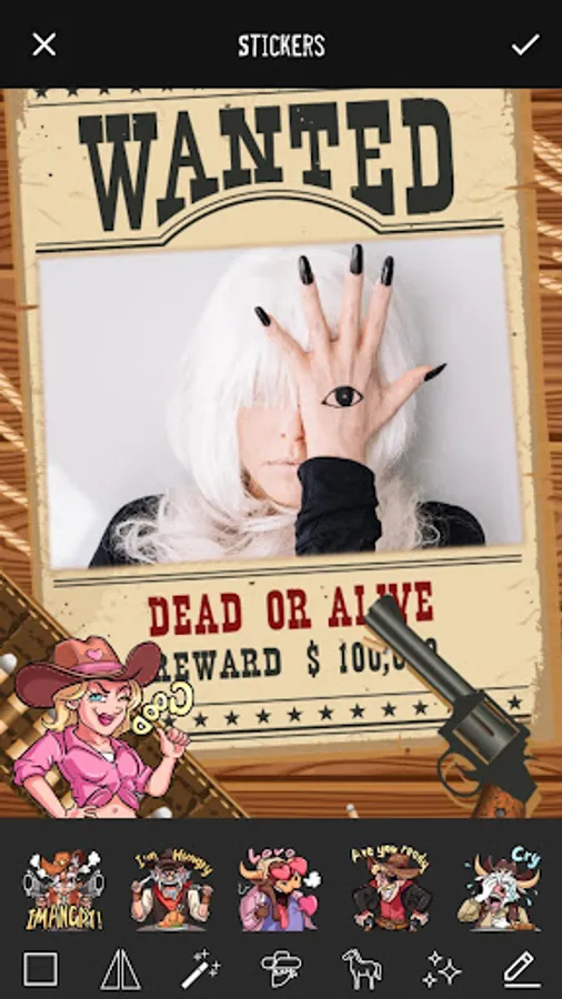 Do you like western movies? If you like to see your face on a wanted poster with criminal's description and the reward for his catch. All your friends will turn you in for a 100 000$ wanted reward with our jail photo editor with effects for mobile and tablets. With Wanted Picture Frames you can make wanted poster in a few seconds and absolutely free. Now you have a chance to feel like a criminal. Wait no more start free Wanted News Photo Frame. Place your face on a most wanted photo and create cool photo manipulation. Wanted Photo Editor lets you add photos from your phone gallery or directly from your camera. Be a famous fugitive with the most Wanted Maker with emoji stickers. This Wanted Photo Editing is easy to use. All you need to do is select a picture from mobile gallery or capture it with mobile camera then apply most wanted poster on it. This is funny app to make people laugh.