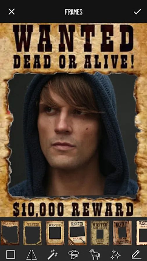 - Choose your favorite Wanted Frames and see the photo image effects and Wanted Filter.