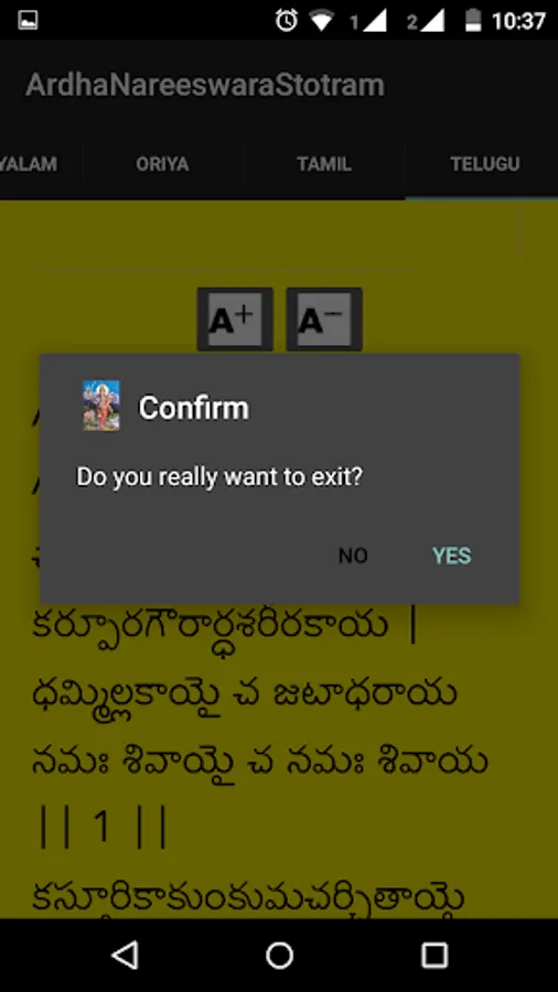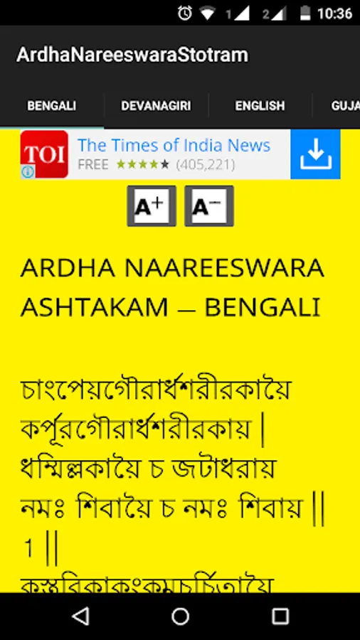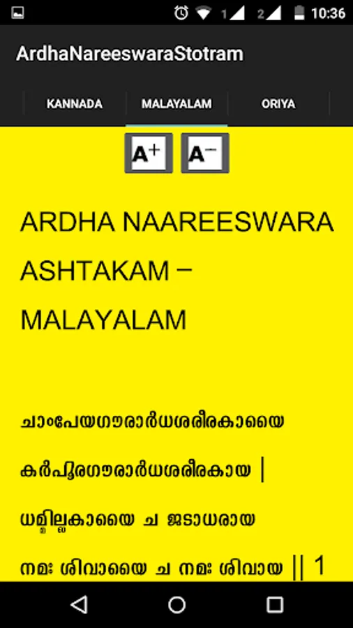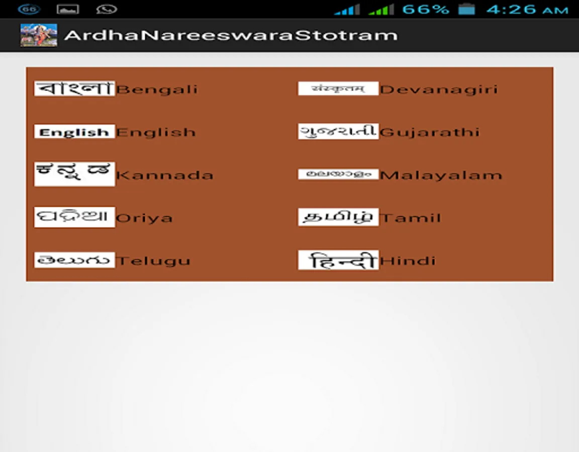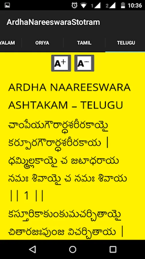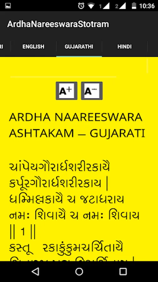 Ardha Nareeswara Stotram is available in this application in eight different languages with audio. Those eight languages are Telugu, Hindi, English, Tamil, Malayalam, Kannada, Bengali, Gujarati, Oriya and Devanagari.