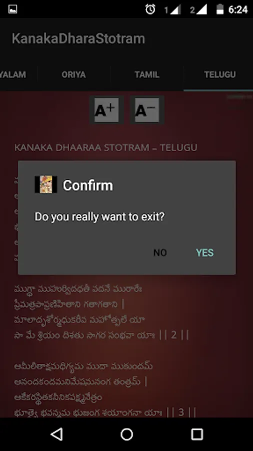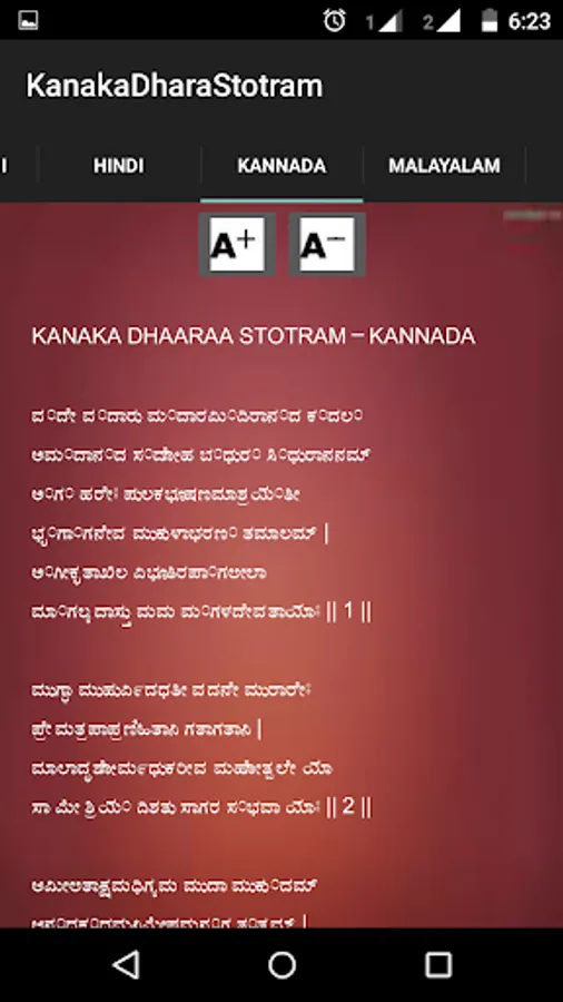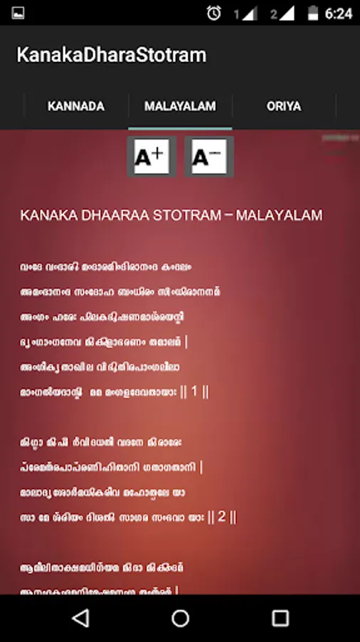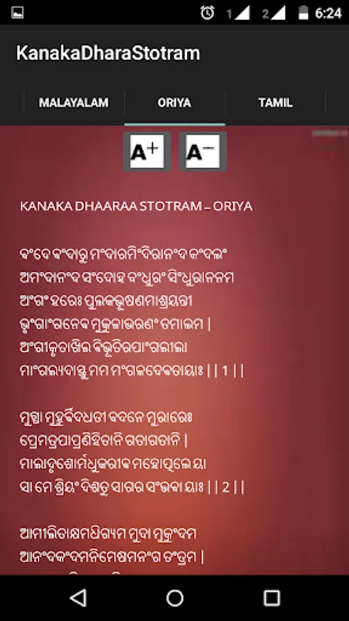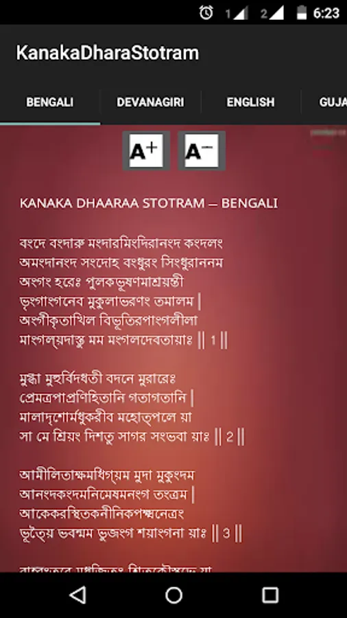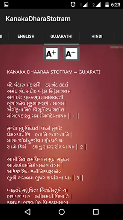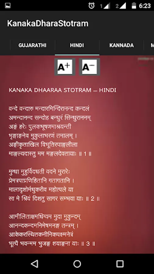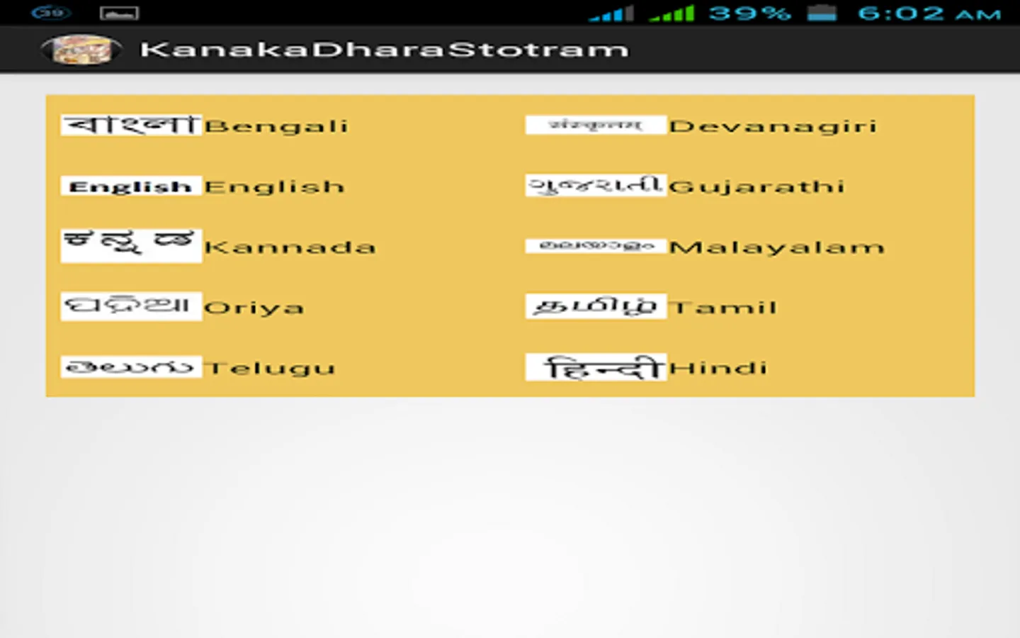 Kanaka Dhara Stotram is available in this application in ten different languages. Those ten languages are Telugu, Hindi, English, Tamil, Malayalam, Kannada, Bengali, Gujarati, Oriya and Devanagari.
