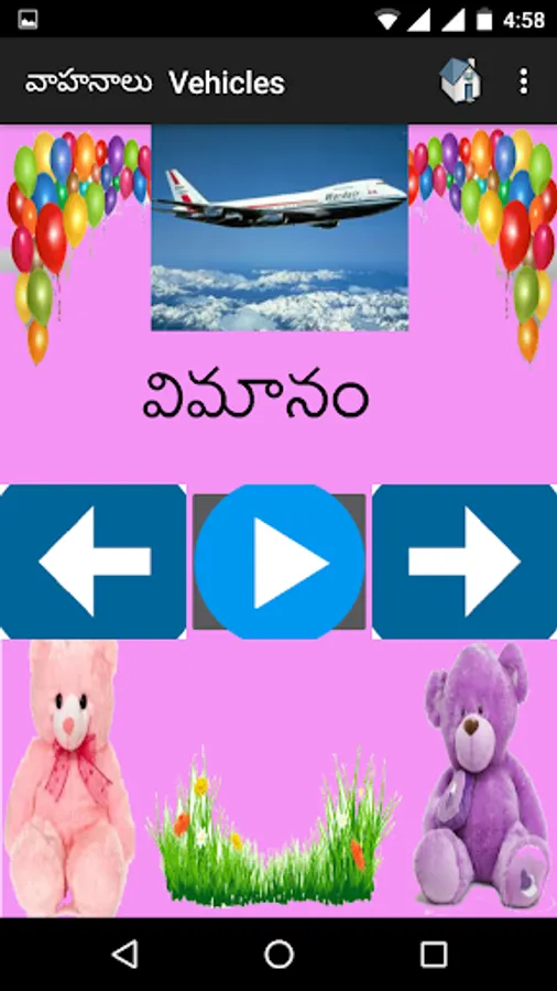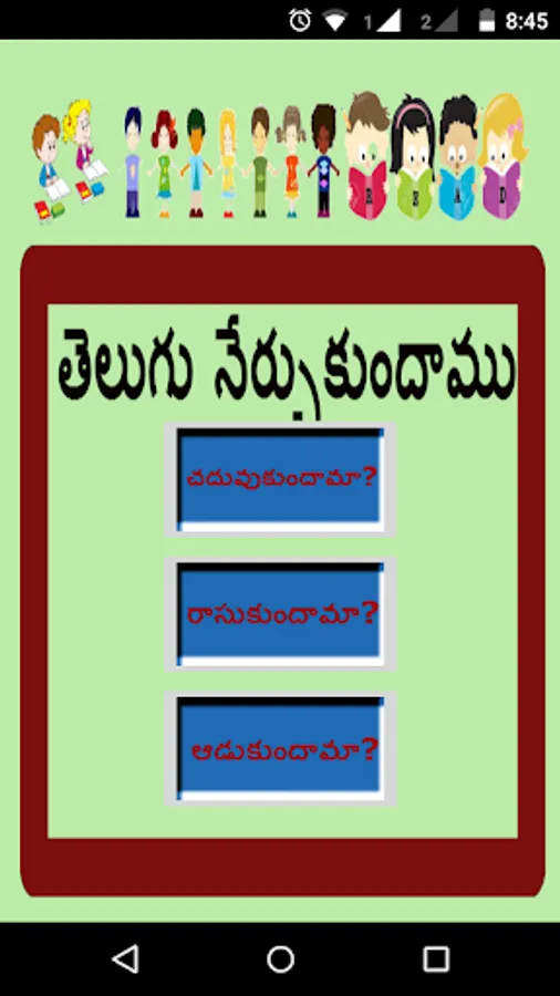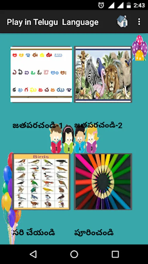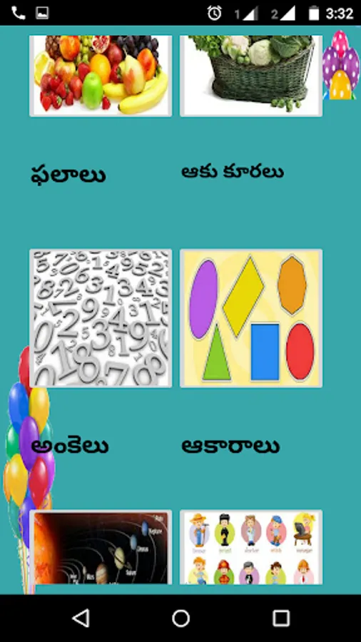 In this app the user can find or learn about Telugu letters,words,fruits, animals, birds,vehicles,spices, colours,shapes, and many more.