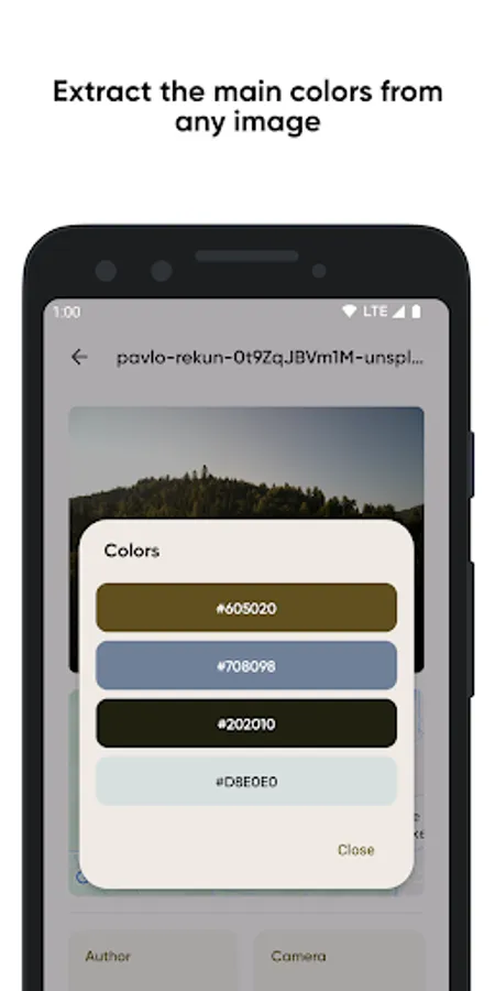 For all designers and ordinary users, the ability to extract colors and search for the location on which the shooting took place is also available. Extract vibrant (dark and light) and muted (dark and light) colors with easy.