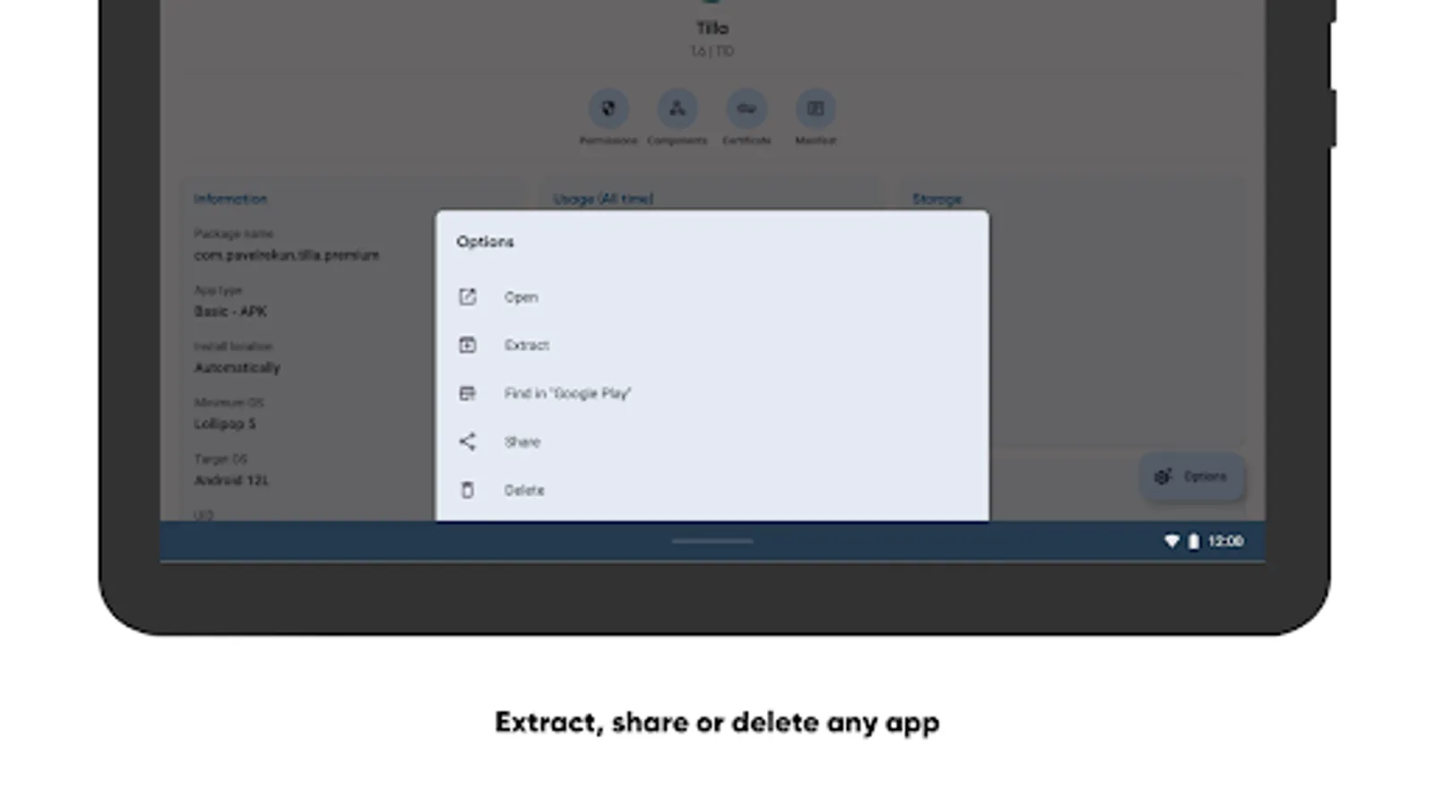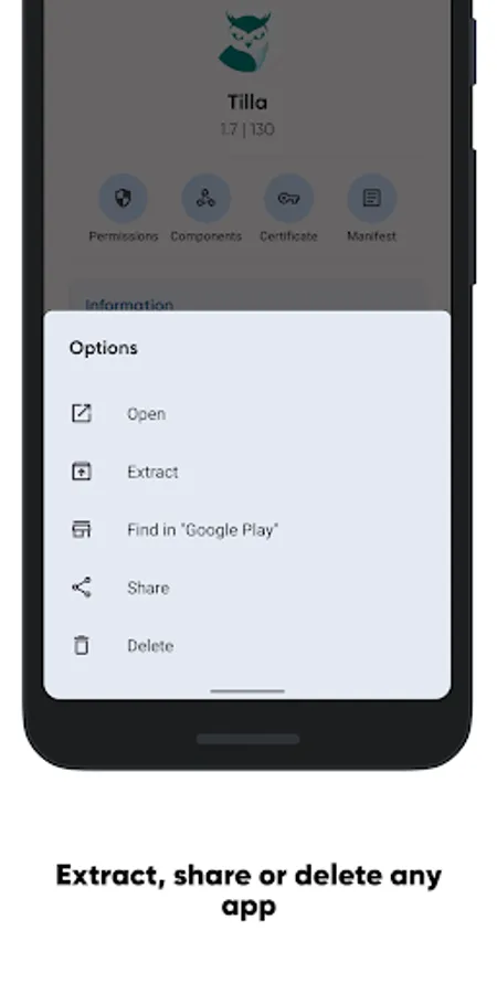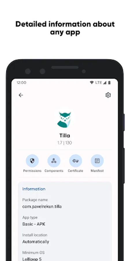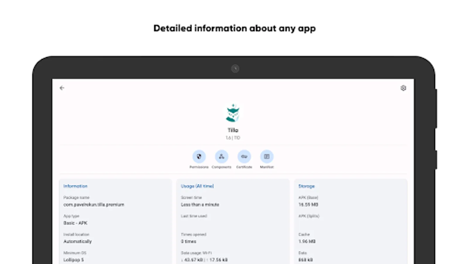 Find out how any selected app works from the inside. The list of activities, manifest, providers, broadcast events, services, used permissions, and even the details of the app's signature certificate are in your hands.