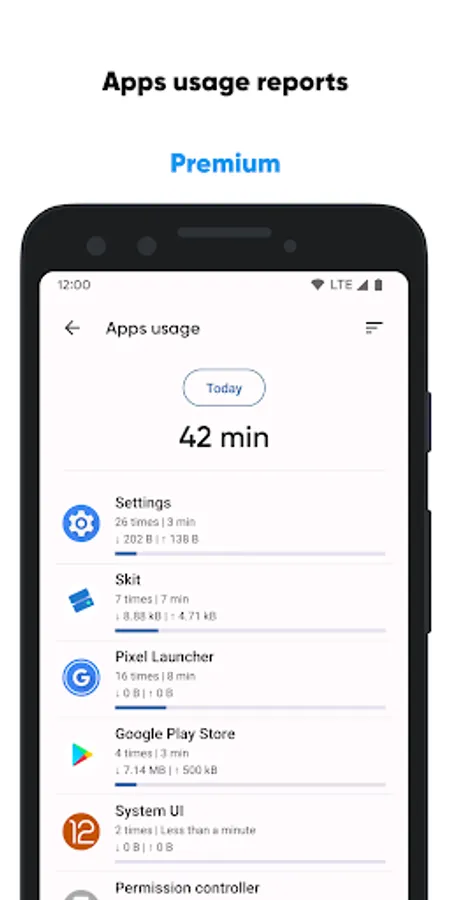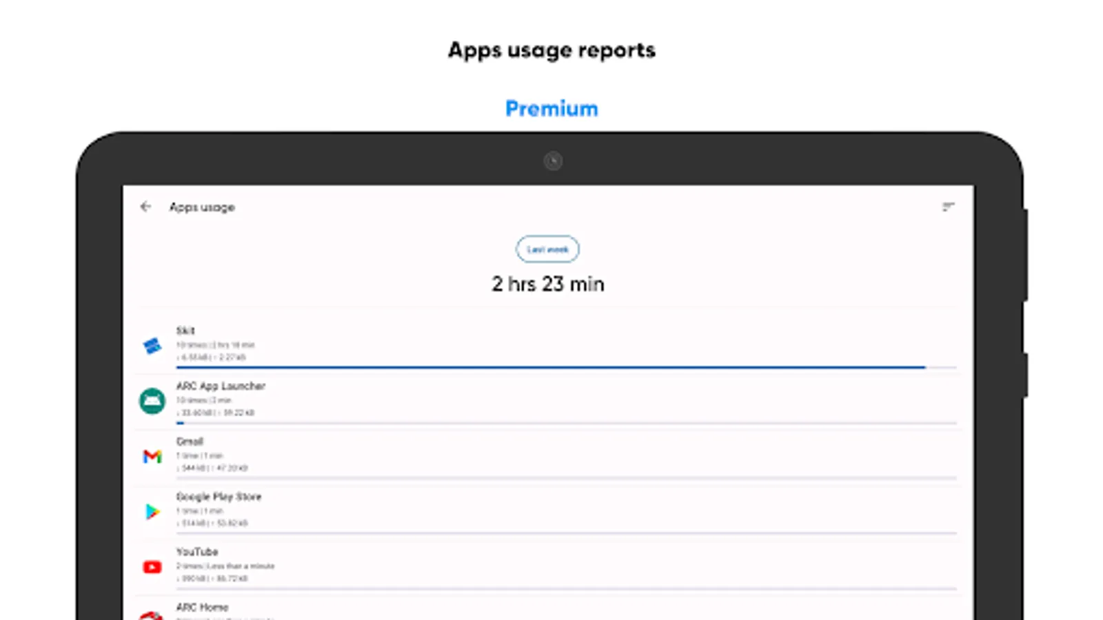 • Apps usage reports to determine the amount of time spent in each app and the amount of data it consumes;